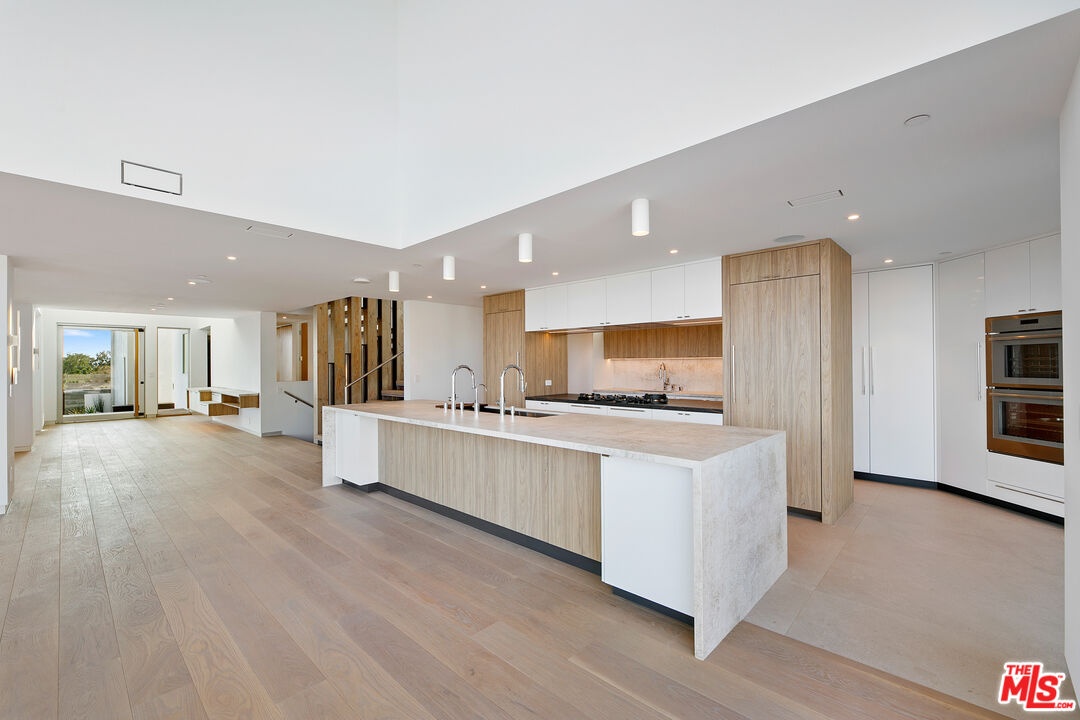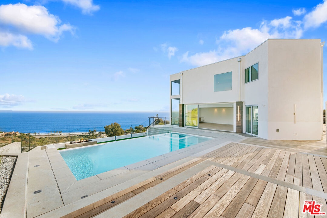 Offering the tranquility only the quiet hills can deliver, while boasting panoramic white water ocean views of Point Dume, Zuma Beach, and beyond, this stunning brand new construction has been thoughtfully crafted down to the last detail. Elevated, clean, and sleek yet warm and intimate, the space exudes an effortless synthesis that accommodates those who love to entertain just as much as they revel in deep relaxation and serenity - true livable luxury. Upon entering the first level, take in the expansive views via the floor to ceiling glass windows and doors, amplified by the open floor plan and framed by the wide plank White Oak wood floors and vaulted ceilings. Top of the line appliances and finishes abound in the gorgeous gourmet kitchen, complete with two sinks and dishwashers, ample storage, and more. Inspired by that ultimate Southern California indoor/outdoor lifestyle, find the yard just off the family room and kitchen complete with refined sitting area, sublime fire pit and luminous pool. Adjacent to the kitchen, a bespoke wine storage and tasting corner awaits before ascending the architecturally striking stair case to the upper level where the breathtaking views endure and the elegant and sumptuous Primary bedroom and bathroom and remaining bedrooms are located. To top off this extraordinary gem, the entire home is Solar Powered, Smart Home equipped, and includes an EV charging station. Don't miss out on this incredible opportunity of unparalleled coastal luxe living