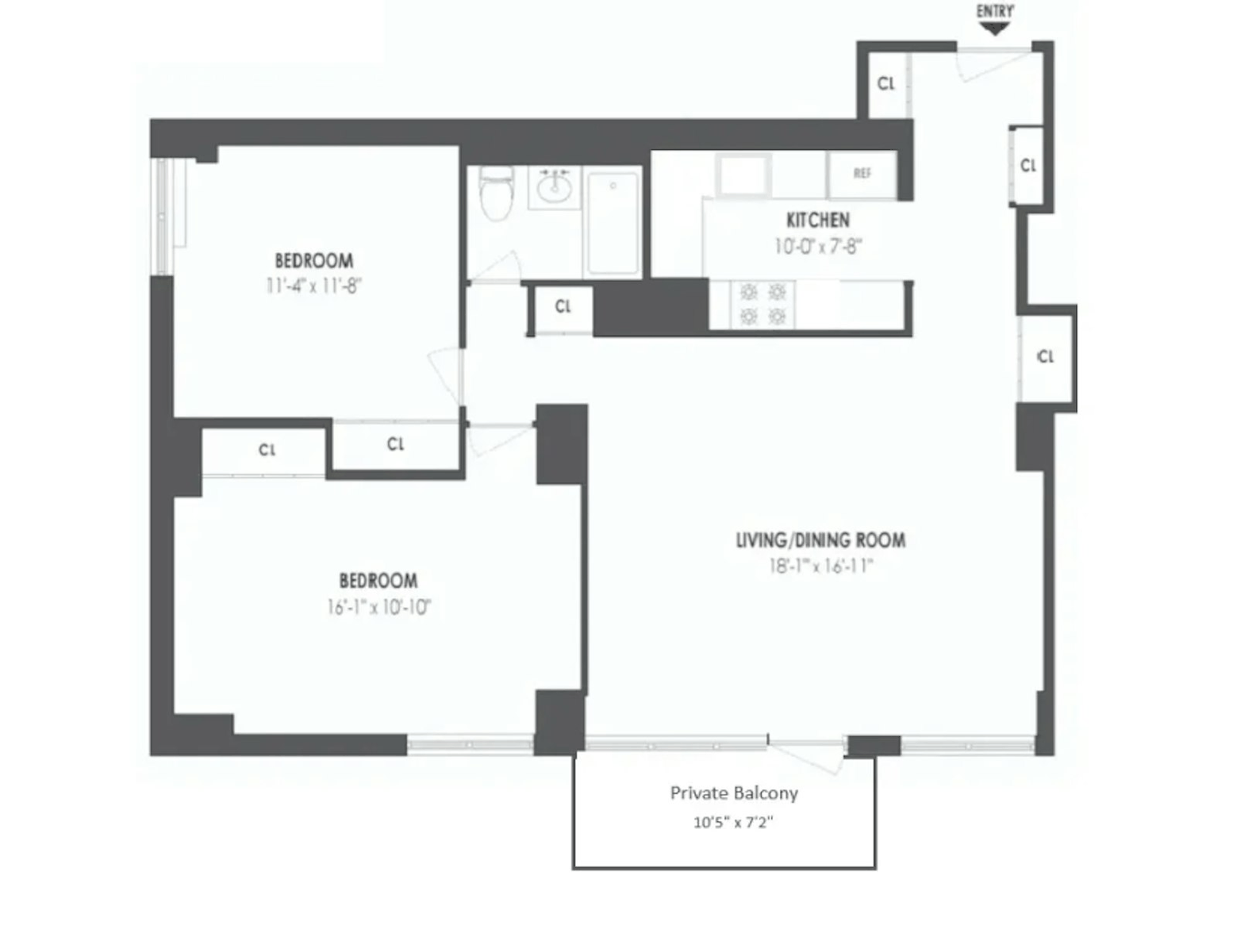 The living room spans an impressive 18' x nearly 17', providing generous space for both living and dining. The primary bedroom measures almost 16' x 11' with plenty of room to add additional closet space if desired. The second bedroom features stunning, direct Brooklyn Bridge views - a rare and charming feature at this price point. The bathroom layout also allows for potential expansion by incorporating the adjacent closet and a portion of the hallway.