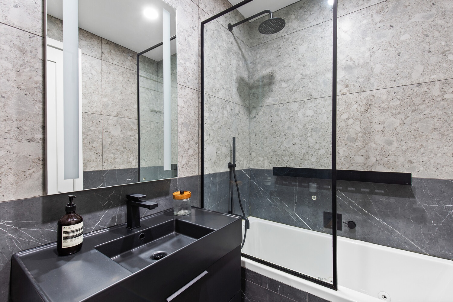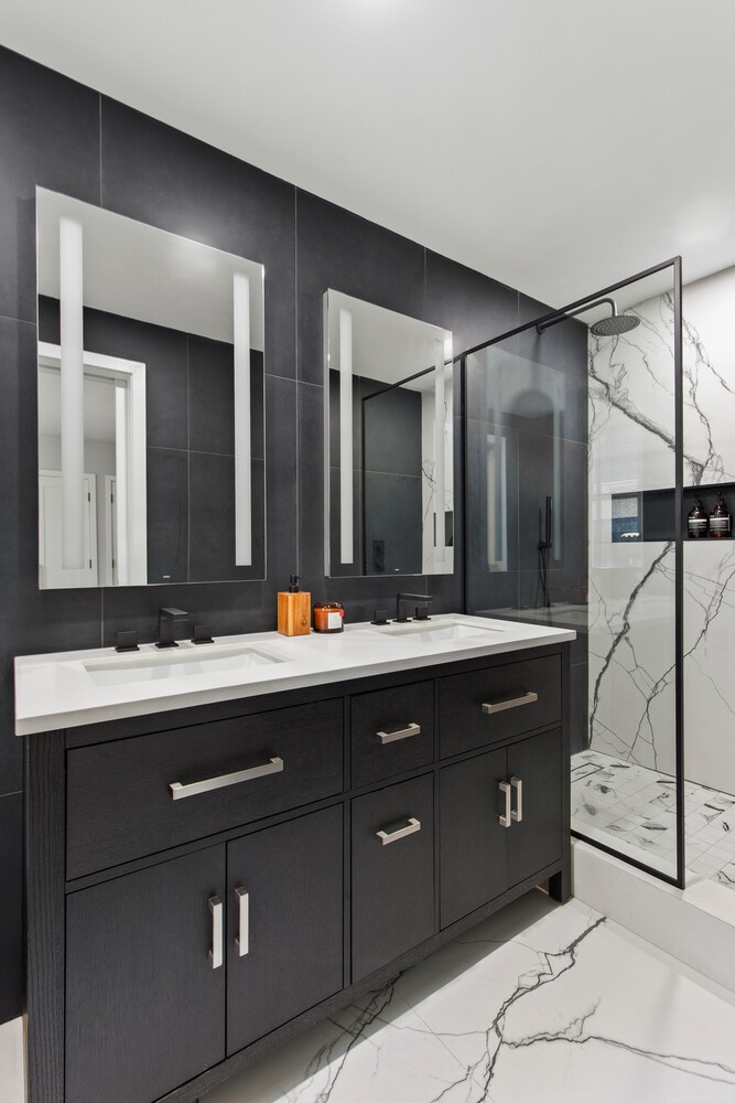 The redesigned floor plan includes a large primary suite with an expanded en-suite bathroom featuring double vanities, a walk-in shower, Florim large-format marble tile, Phylrich fixtures, matte-black hardware, and LED mirrors. The secondary bedroom offers a handmade thin-brick accent wall and a custom closet designed for flexible use. The second full bathroom was also fully renovated with upgraded materials, added cabinetry and Jacuzzi tub.