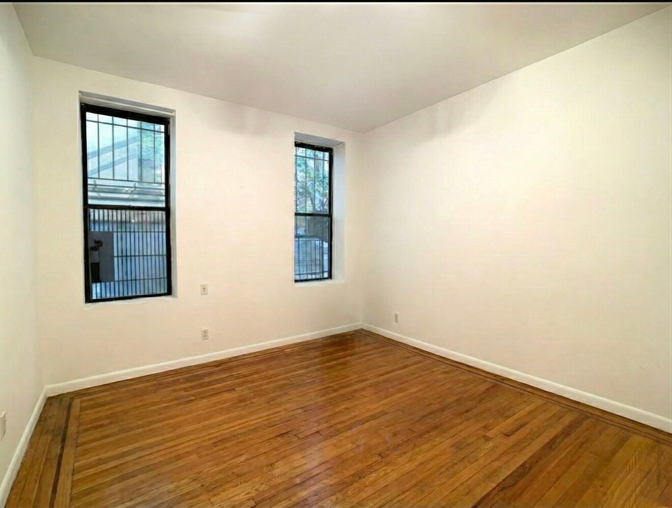 The bedroom, facing the back of the building, overlooks a back garden and graciously receives the perfect amount of tree-filtered light during the day while promoting peace and quiet. The room is large enough to fit a king-size bed with a nightstand and dresser comfortably. The bathroom combines even more functionality and charm with a window for airflow, a full-size tub, and practical shelving.