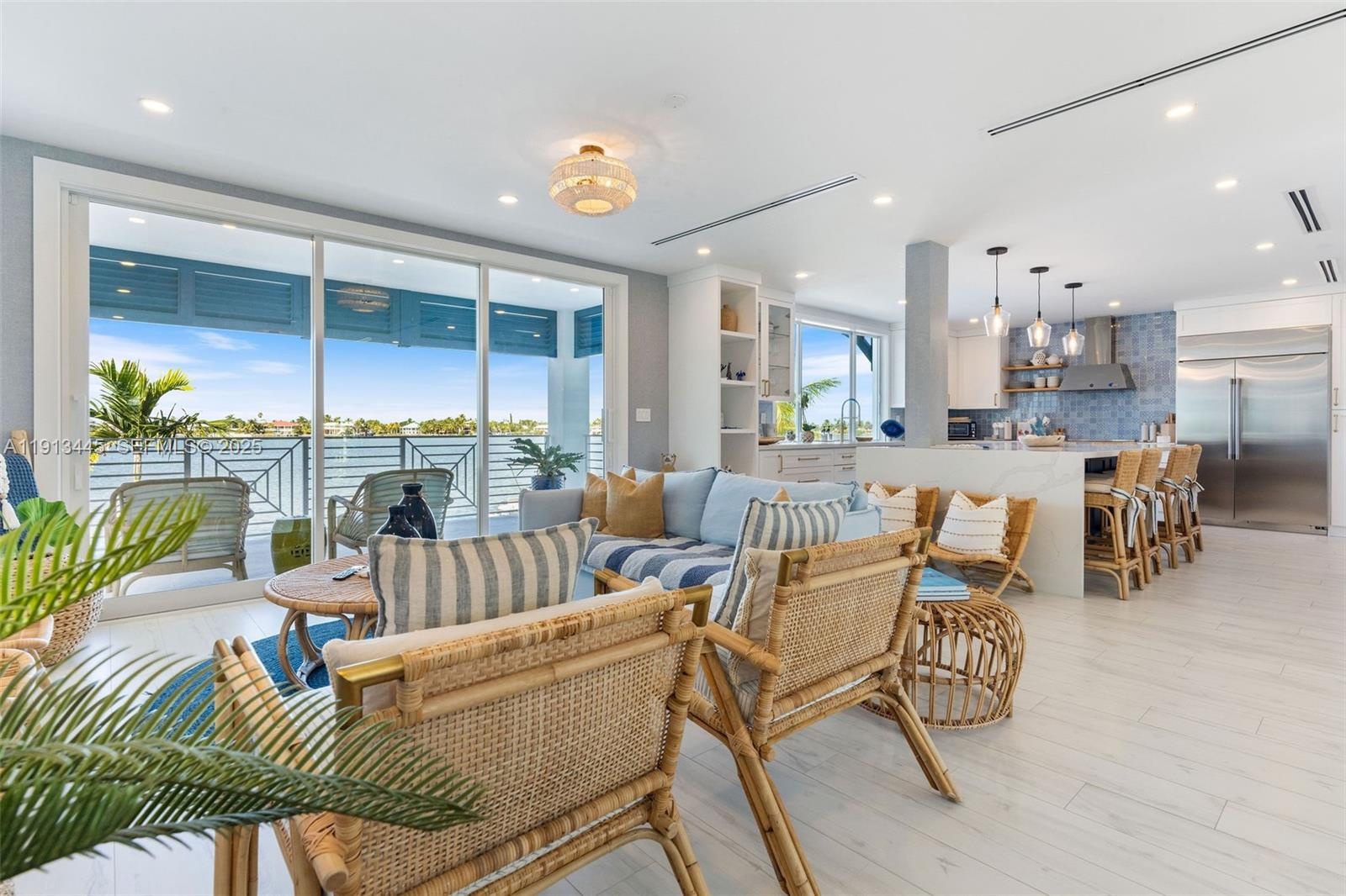 Inside, the heartbeat of the home is a true chef's kitchen featuring high-end appliances, huge quartz waterfall island, and an open-concept design that flows into bright living and dining spaces. Oversized terraces extend your outdoor living space, complete with a summer kitchen made for alfresco cooking under sunlit skies and moonlit nights. The primary suite is its own private retreat, an entire level devoted just to you. Enjoy a sun-washed deck, generous walk-in closet, and a balcony that frames shimmering water views. It's a Zen-zone where you can start and end the day in absolute calm.