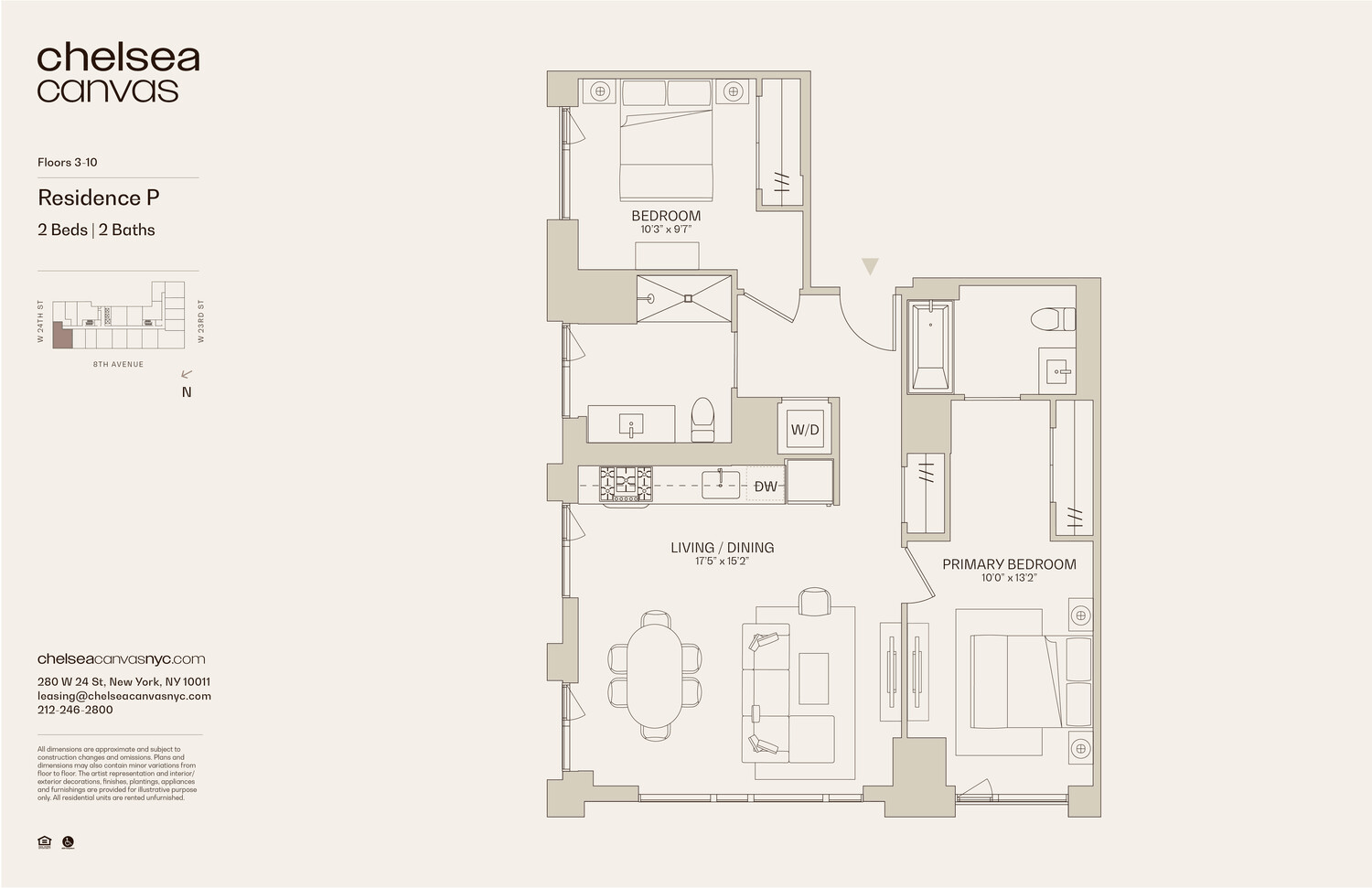 Elegance finds its form at Chelsea Canvas. This mindfully designed two-bedroom residence has floor-to-ceiling windows, ceiling heights up to 12'7", and white oak flooring throughout. The P line is a corner unit facing both North and West. It has two large bedrooms and ample closet space.