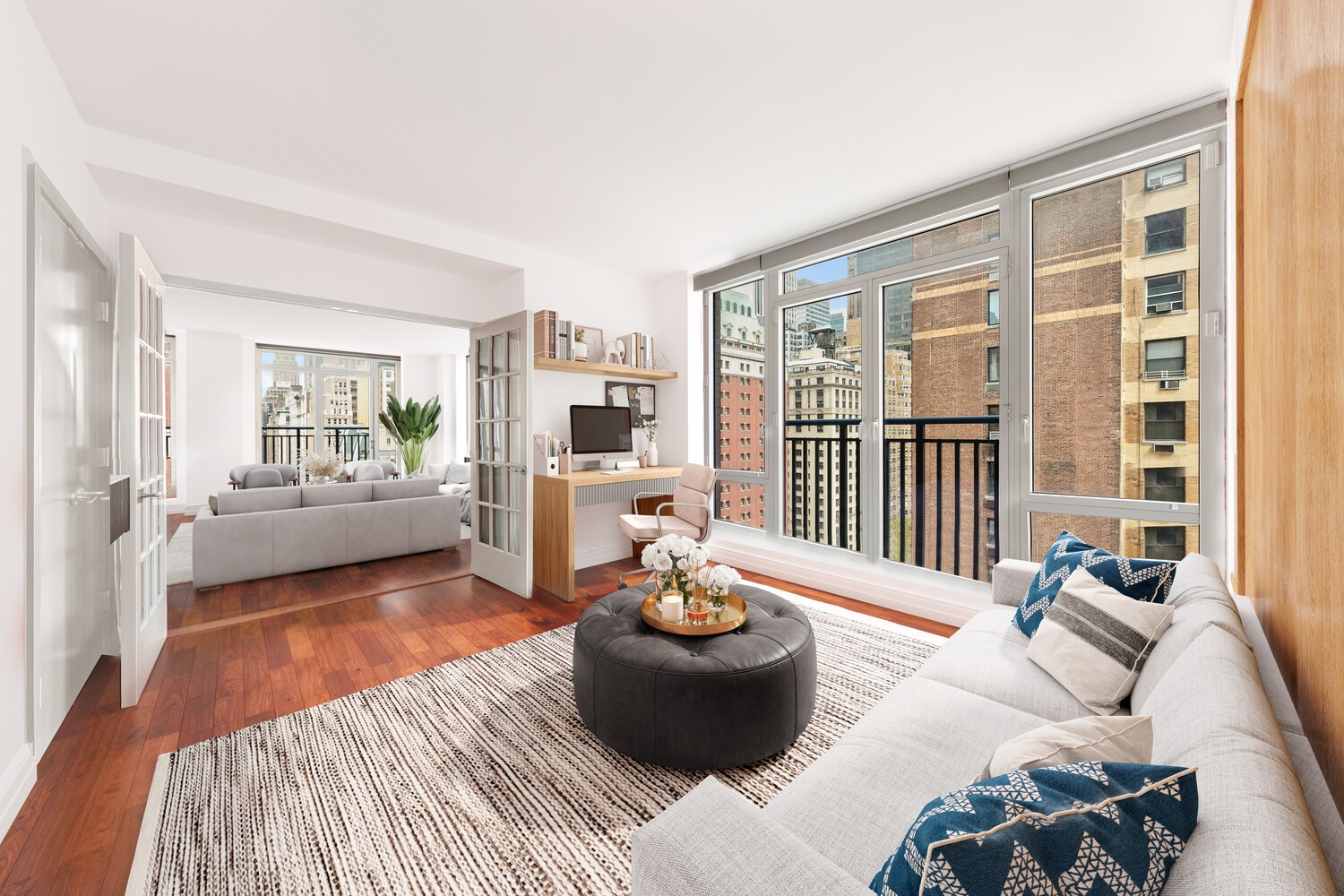 Experience iconic city views in this sun-filled two-bedroom, two-and-a-half-bathroom condominium at 45 Park Avenue, designed by architect Costas Kondylis. This 1,494-square-foot home features floor-to-ceiling windows, Juliet balconies, and 11-foot ceilings, offering breathtaking skyline vistas of the Empire State and Chrysler Buildings.
