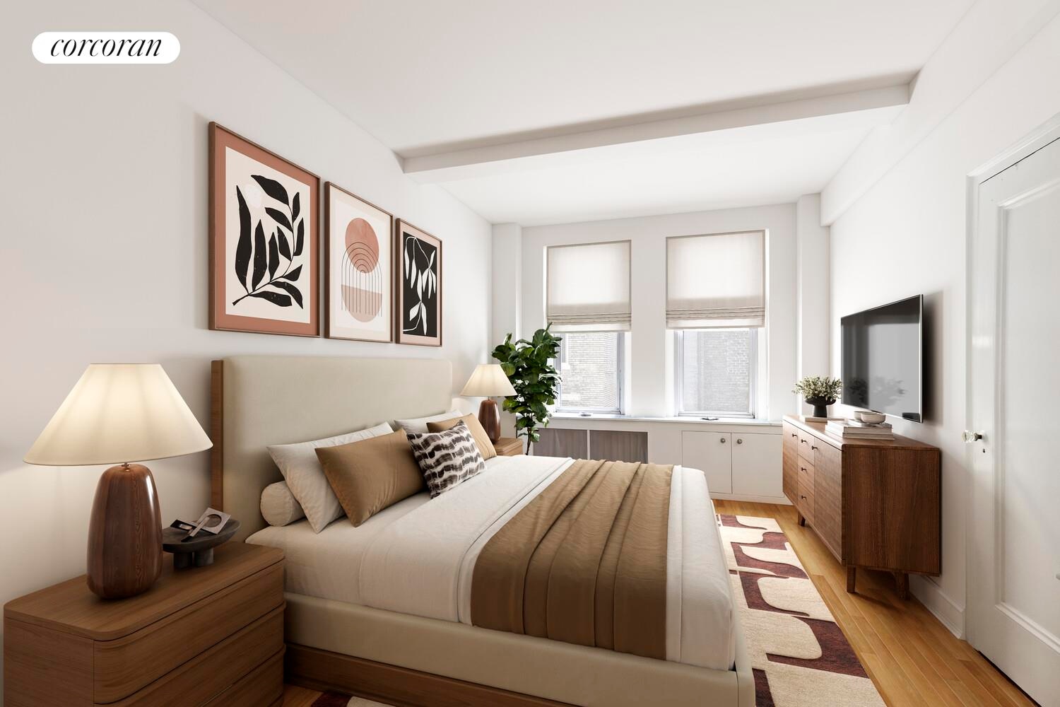 A gracious entry foyer leads to a spacious living room with 9' 4" beamed ceilings and lovely hardwood floors. This large room offers a flexible layout and can accommodate multiple seating arrangements, as well as a dining area and home office. The renovated kitchen is finished with handsome custom cabinetry, stainless steel appliances and room for a delightful breakfast table by the window. The expansive bedroom is pin drop quiet and boasts an oversized walk-in closet. A windowed bathroom has been tastefully updated while retaining its prewar charm with a mosaic tiled floor, subway tiled walls, a pedestal sink and classic bathtub/shower combination. The apartment is complete with through-wall AC and 3 large closets, all custom designed to maximize storage.