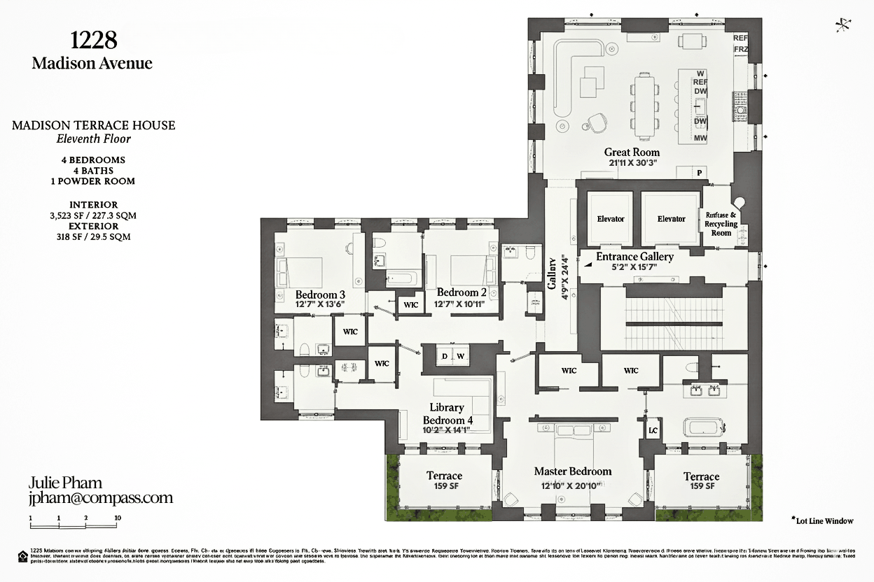 The Eleventh Floor at 1228 Madison Avenue is a rare full-floor 4-bedroom, 4.5-bath home with 3,523 sq. ft. and quadruple exposures, offering sweeping views of Central Park and the Reservoir. A private elevator vestibule and dramatic 8’ white oak door set the tone, opening into a stunning foyer with custom chevron oak flooring that leads into an extraordinary corner great room wrapped in oversized windows and natural light.