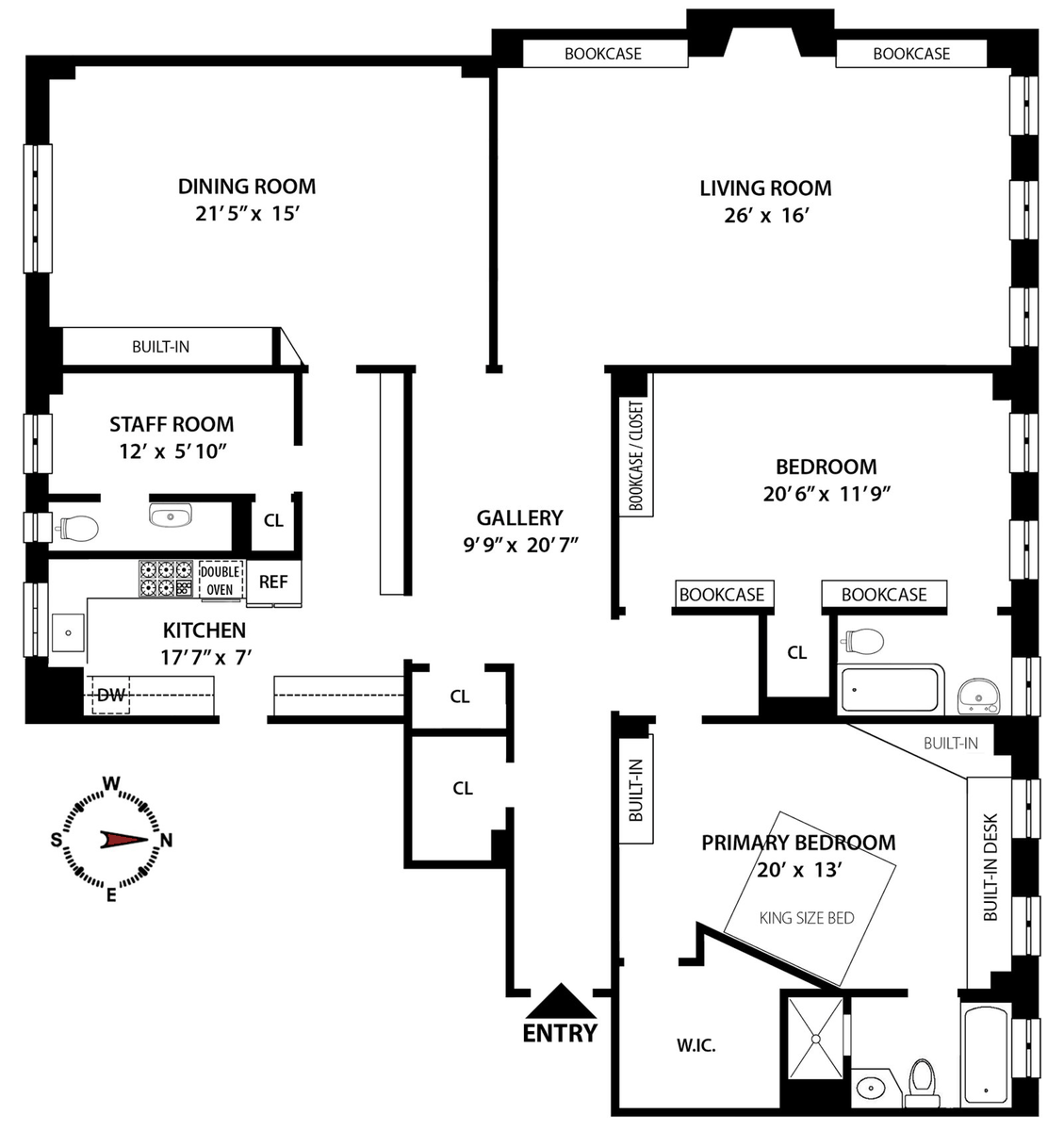The large, windowed kitchen, staff room, and bath offer tremendous potential and await your personal touch. Two oversized bedrooms, each with en-suite baths, have exceptional closet and storage space, offering comfort and flexibility rarely found in the city.