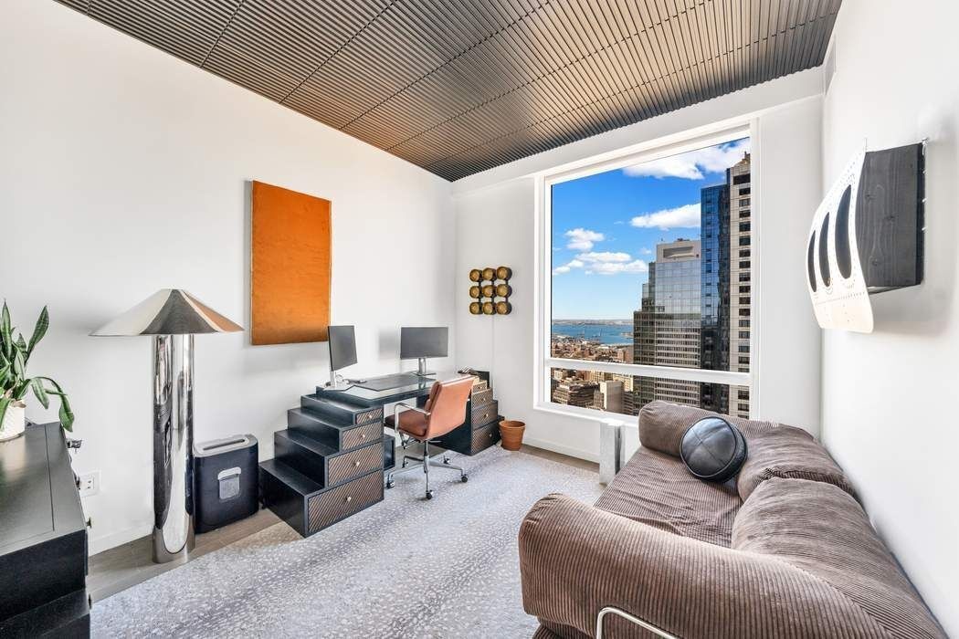 Rarely available, residence 48A is a mint-condition 2-bedroom, 2-bath corner home facing West and North, showcasing sweeping, unobstructed skyline views that span all of Manhattan and Brooklyn, including its most iconic landmarks. Floor-to-ceiling windows flood the spacious layout with light, complemented by wide-plank oak floors, 10-foot ceilings, custom window treatments, an in-unit washer/dryer, and a warm palette of light wood and satin copper. The open living, dining, and kitchen areas frame the city beyond, while the kitchen offers an eat-in island, quartz countertops, custom oak millwork, a Sub-Zero wine fridge, and integrated Miele appliances.