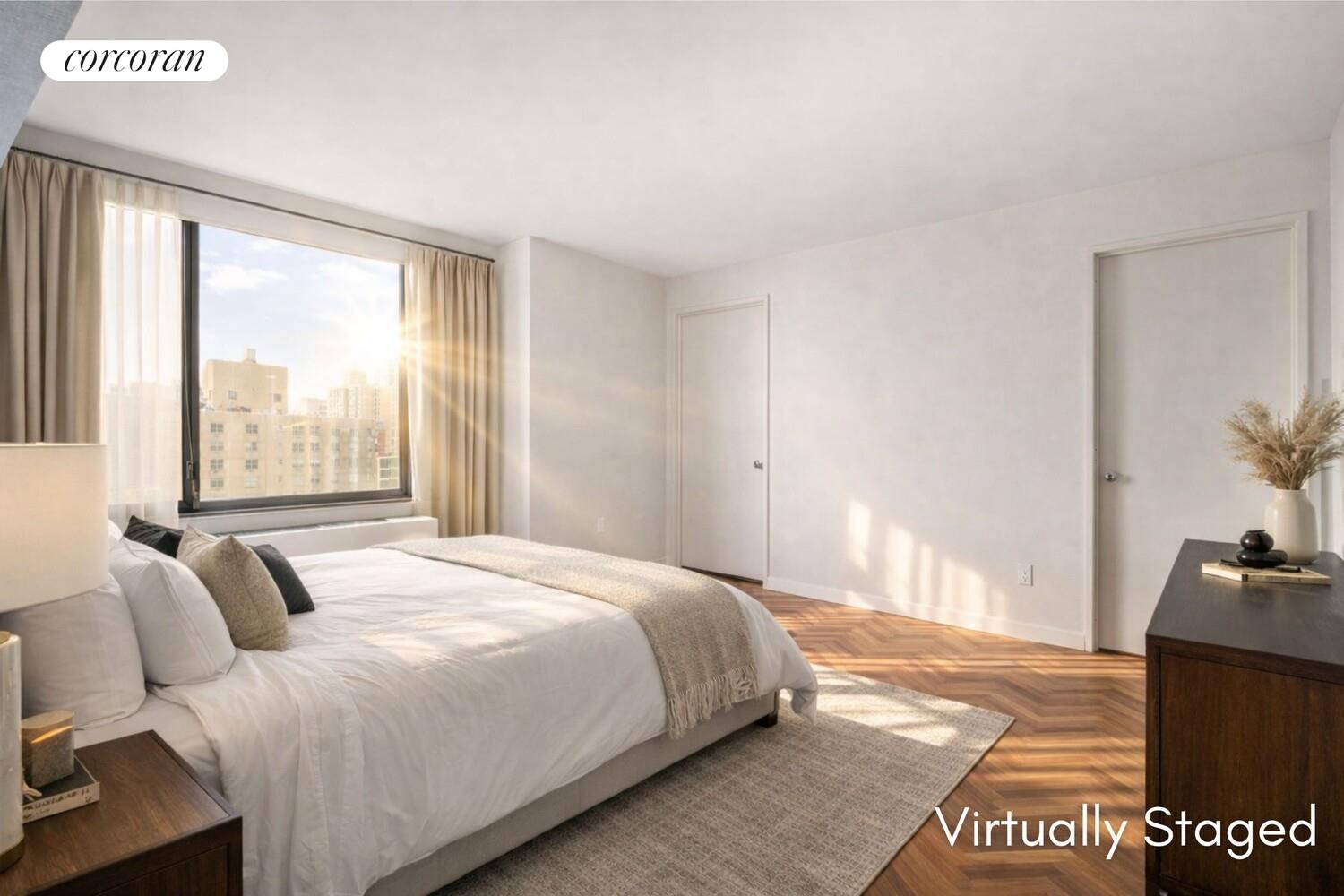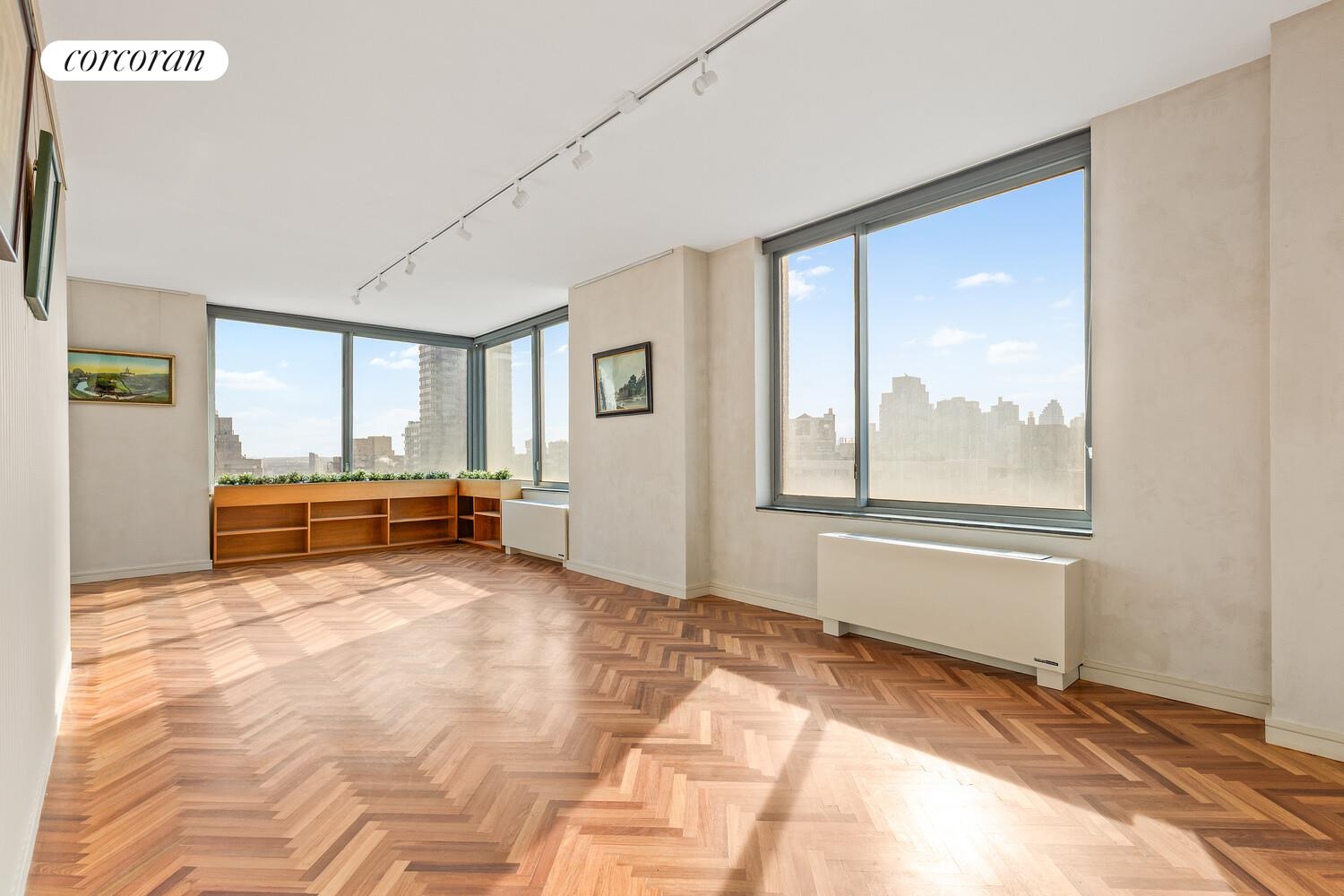 This generously proportioned 2-bedroom, 2.5-bath home features timeless herringbone hardwood floors, a gracious living and dining area, and a versatile layout that can be seamlessly reimagined as a comfortable three-bedroom. A wall of windows brings in warm natural light from morning through afternoon, highlighting both the open views and the elegant scale of the home.