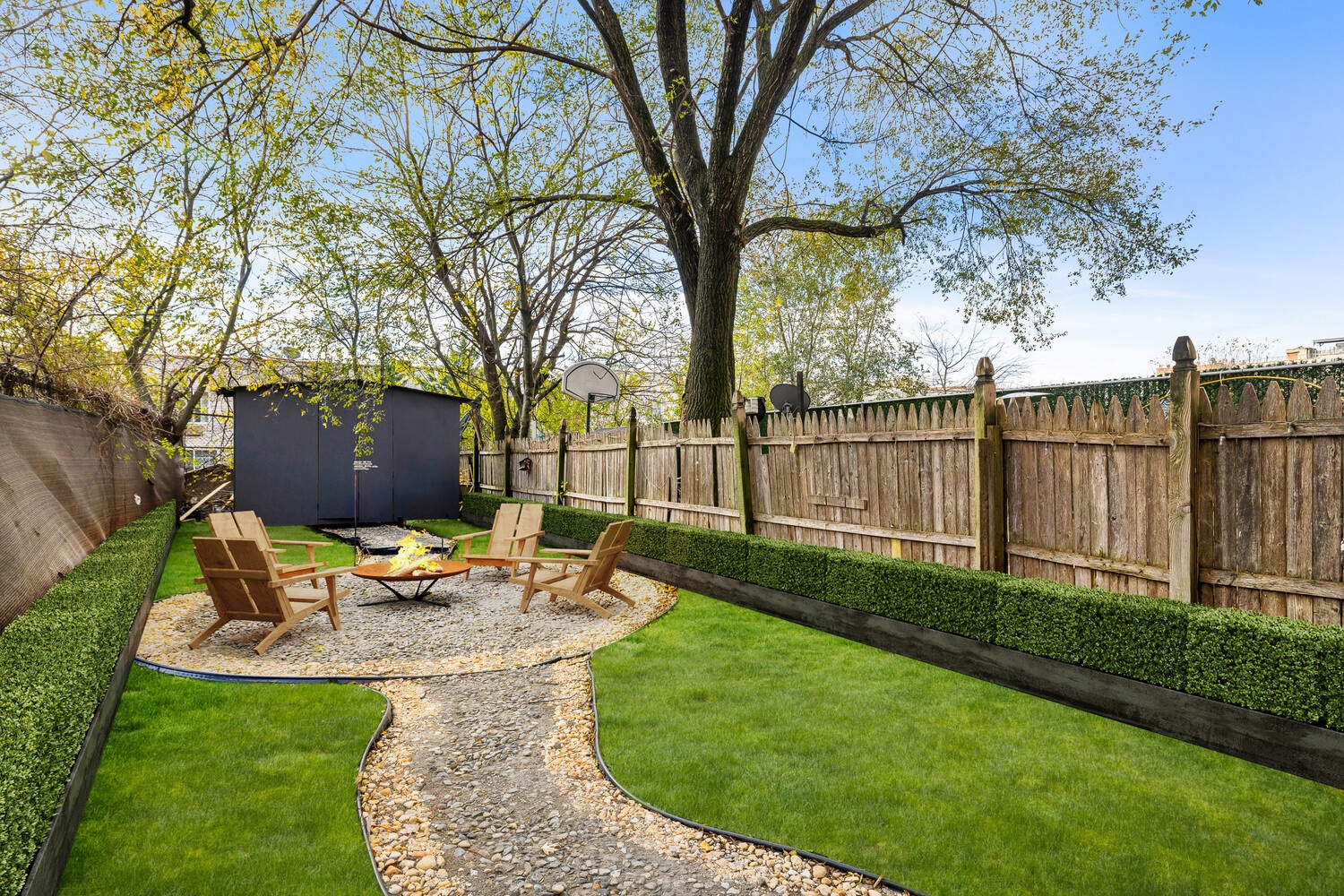 Enjoy a spacious, private backyard featuring a large patio set up for outdoor lounging, a stone walkway, and a cozy fire-pit area surrounded by trees. Perfect for entertaining, relaxing, and creating an outdoor oasis right at home.