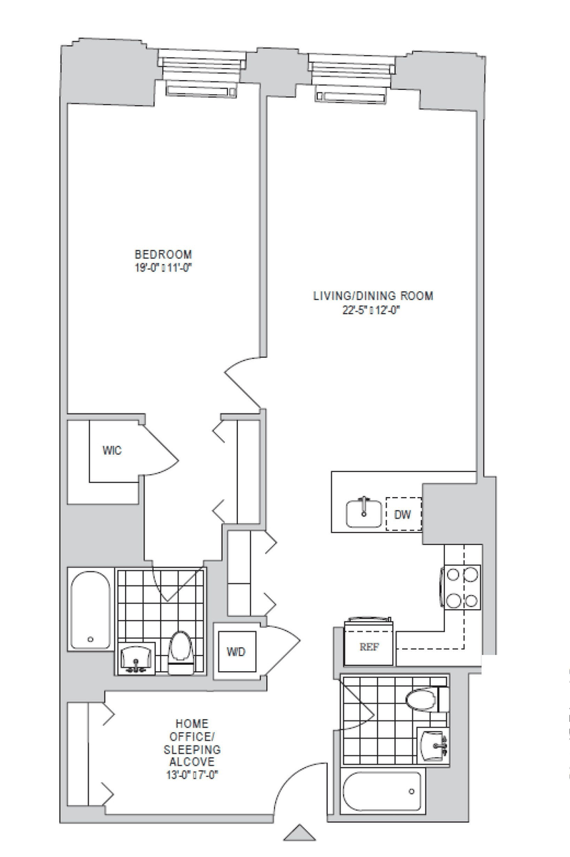 This unique one bedroom two bath has a separate foyer perfect for an at-home office, large living room with good natural light, L-shaped kitchen with an eating bar, high ceilings, large en-suite walk-in closest with dressing area in primary bedroom, multiple closets, wood floors throughout, and in-unit washer/dryer.