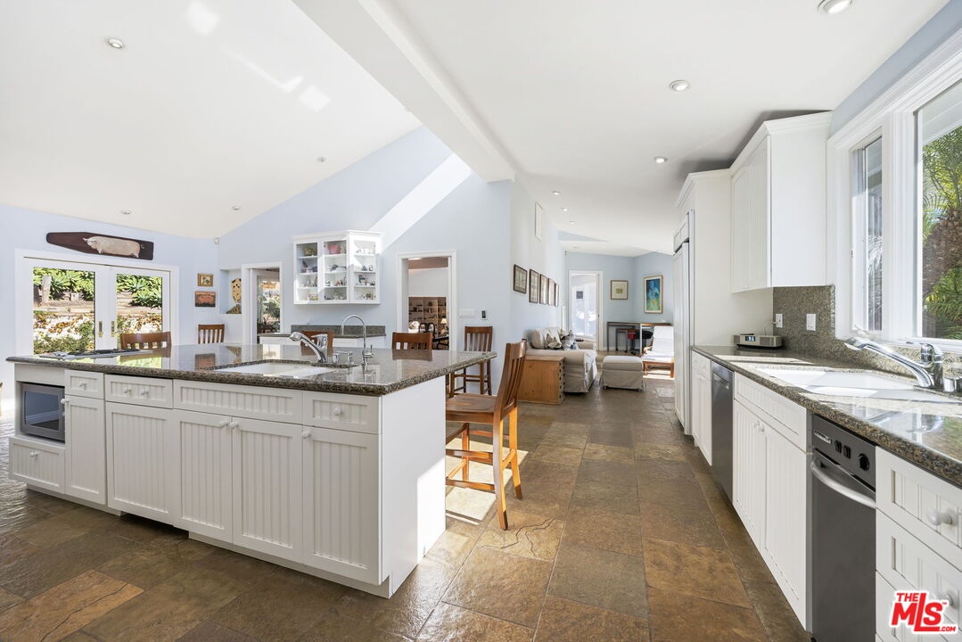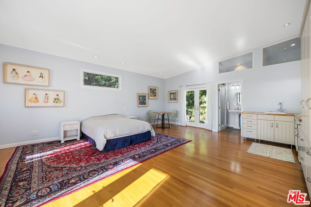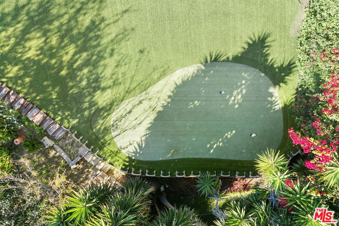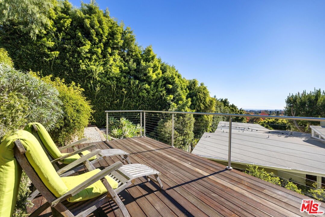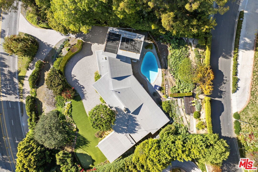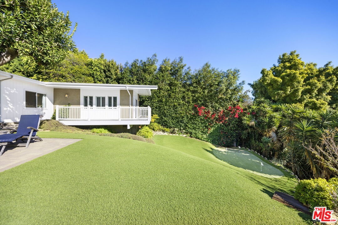 Lower Bel Air fully furnished 4 bed, 5 bath, 3,496 sq ft updated Mid-Century Modern home set privately above Sunset Boulevard. Surrounded by gardens, a solar-heated pool, putting green and multiple outdoor seating areas, the property offers layered views, including ocean outlooks from the second floor. Vaulted ceilings and high windows fill the main living spaces with natural light. The chef's kitchen anchors the home with a grand granite island, gas range with griddle, double ovens, dual dishwashers and separate refrigerator and freezer, opening to the patio and pool terrace with built-in BBQ, covered dining and open-air spaces for entertaining. Living areas include a living room with fireplace, library/den with bar, TV/office area and formal dining room. The primary suite features custom built-ins, double sinks, walk-in shower, jetted tub and direct veranda access. Two additional bedrooms each include their own bathrooms, while a separate second-story suite offers a kitchenette, full bath, two balconies and a flexible room ideal for guests, gym or office. Additional features include a laundry room, guest bath with steam shower and direct-entry garage with storage and golf practice bay. Terraced gardens, pathways and elevated decks provide tranquil vantage points, creating a retreat-like environment moments from Brentwood Village, the Country Mart, dining and canyon access. This residence combines ease of living with the privacy and presence of a secluded compound in one of Lower Bel Air's most desirable neighborhoods.