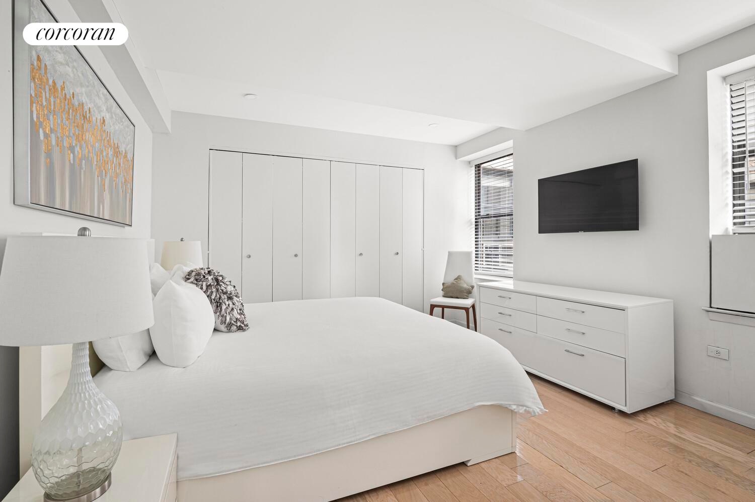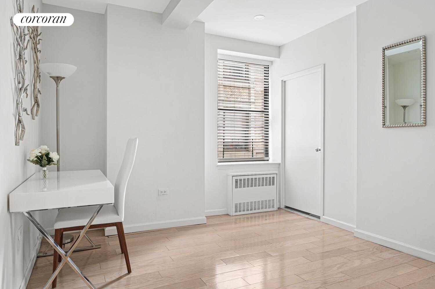Offering the perfect mix of comfort and convenience, this is one of the building's Largest and most desirable layouts. with the potential to convert it into a two-bedroom residence, or an office, allowing for flexible living arrangements. The apartment features a spacious bright living room with a dining area and an open kitchen equipped with high-end appliances - perfect for entertaining. The king-size bedroom offers abundance of storage space and has room for a desk or personal touch. With West and south exposures flooding the space with natural light and four oversized closets, storage is abundant. A renovated windowed bathroom, new floors throughout and high end finishes all around the space, designed for comfort living and style.