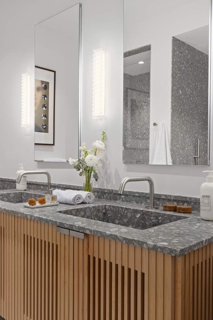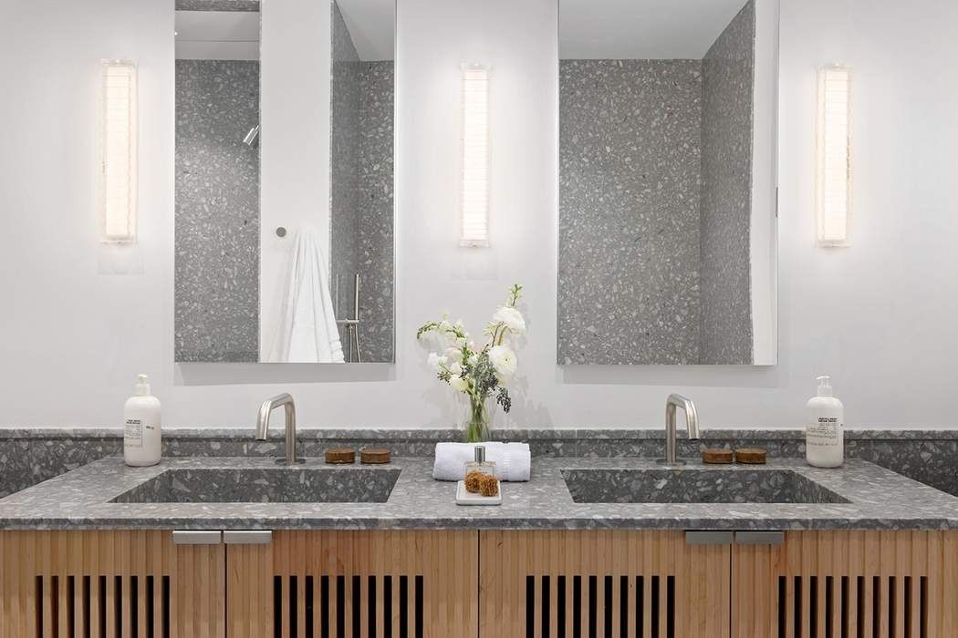 The primary suite, with its views of the East River features a large walk-in closet and an en-suite bathroom with Agglo Ceppo honed stone walls, flooring and countertops, brushed nickel shower controls, a freestanding soaking tub, and a custom-slatted white maple double vanity with satin nickel pulls, deck-mounted faucets and oak controls.