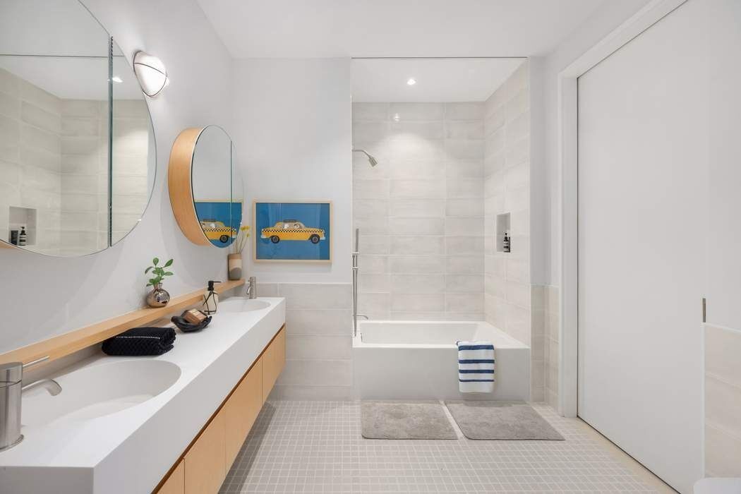 The secondary bedrooms share a directly accessible bathroom, with mosaic flooring, undermount tub with brushed nickel fixtures, custom vanity in maple and a rounded medicine cabinet.