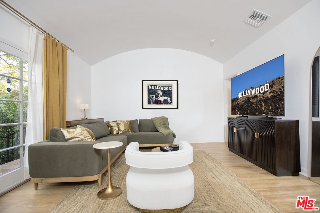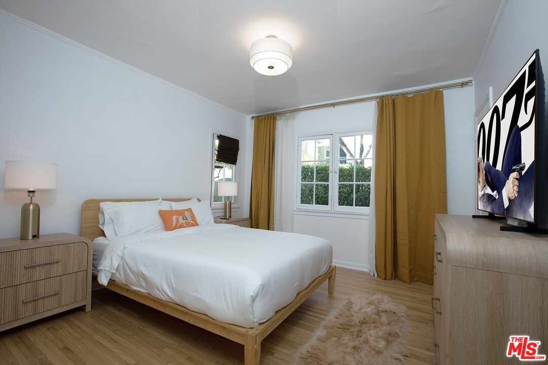 Welcome to a fully remodeled, FULLY FURNISHED, and truly move-in-ready West Hollywood bungalow that lives like a single-family home -- private, polished, and effortlessly stylish. This 2-bedroom residence has been fully reimagined from top to bottom with elevated modern finishes and effortless, turn-key living throughout. The open living space is bright, warm, and inviting -- layered with custom finishes, designer lighting, curated furnishings, and statement art throughout. The kitchen is both beautiful and functional, featuring custom wood cabinetry, quartz counters and backsplash, modern espresso colored appliances, premium hardware, filtered drinking water, and a sleek built-in microwave drawer -- all anchored by a full-size stacked washer and dryer! Both bedrooms are stylishly ideal for full-time living, creative work-from-home, or elevated guest hosting. The spa-inspired bathroom delivers custom tilework, an oak vanity with marble top, and a back-lit mirrored medicine cabinet for a hotel-like feel. Step outside to your own hedge-wrapped private front yard -- your personal outdoor lounge for morning routines, sunset cocktails, and entertaining under the stars! The home includes one private garage space plus easy street parking (street parking permits available), a rare luxury in this neighborhood. Set just moments from Melrose Ave, Santa Monica Blvd, Plummer & Poinsettia Parks, Trader Joe's, top cafes, shopping, and nightlife, this refined home puts West Hollywood's best at your doorstep.