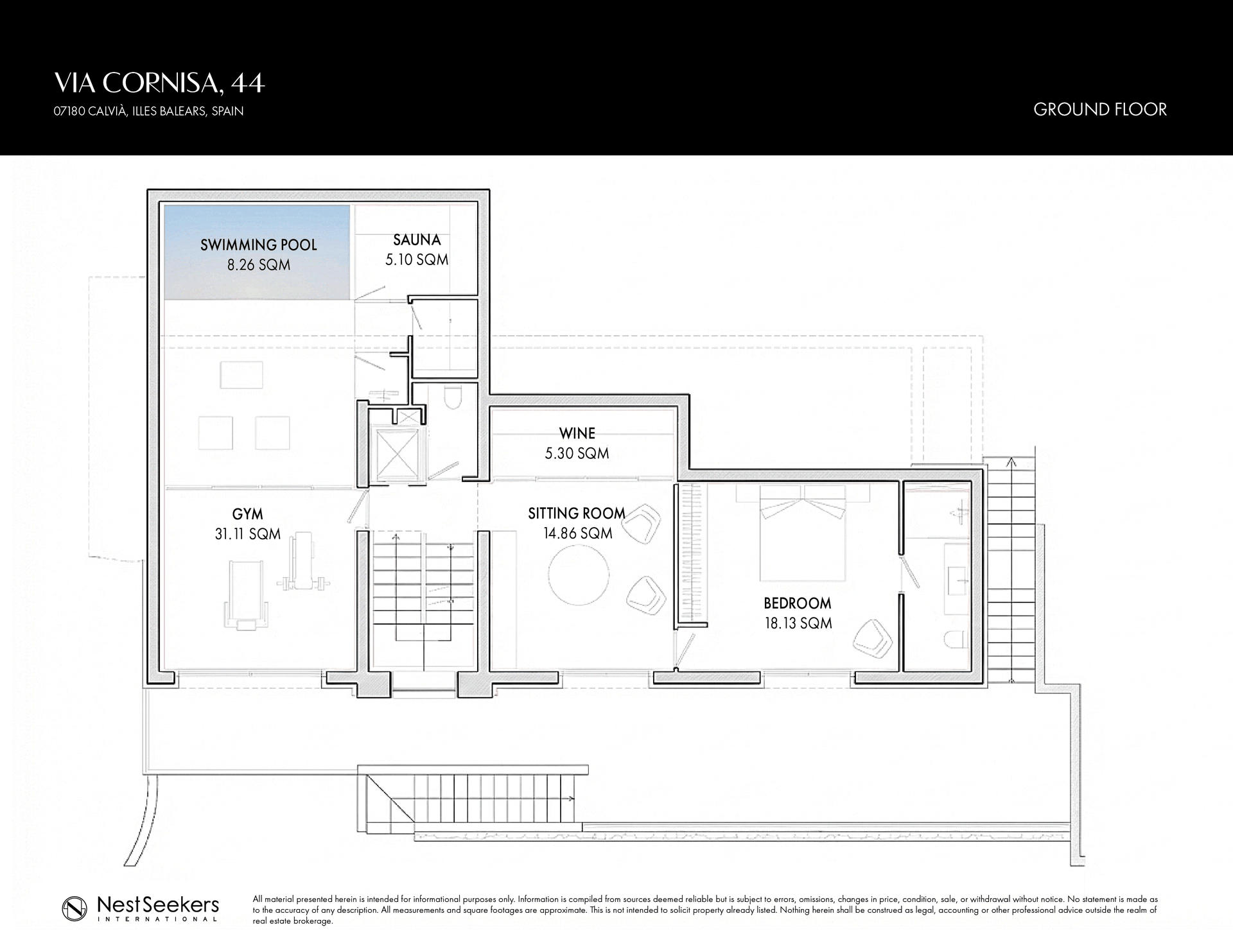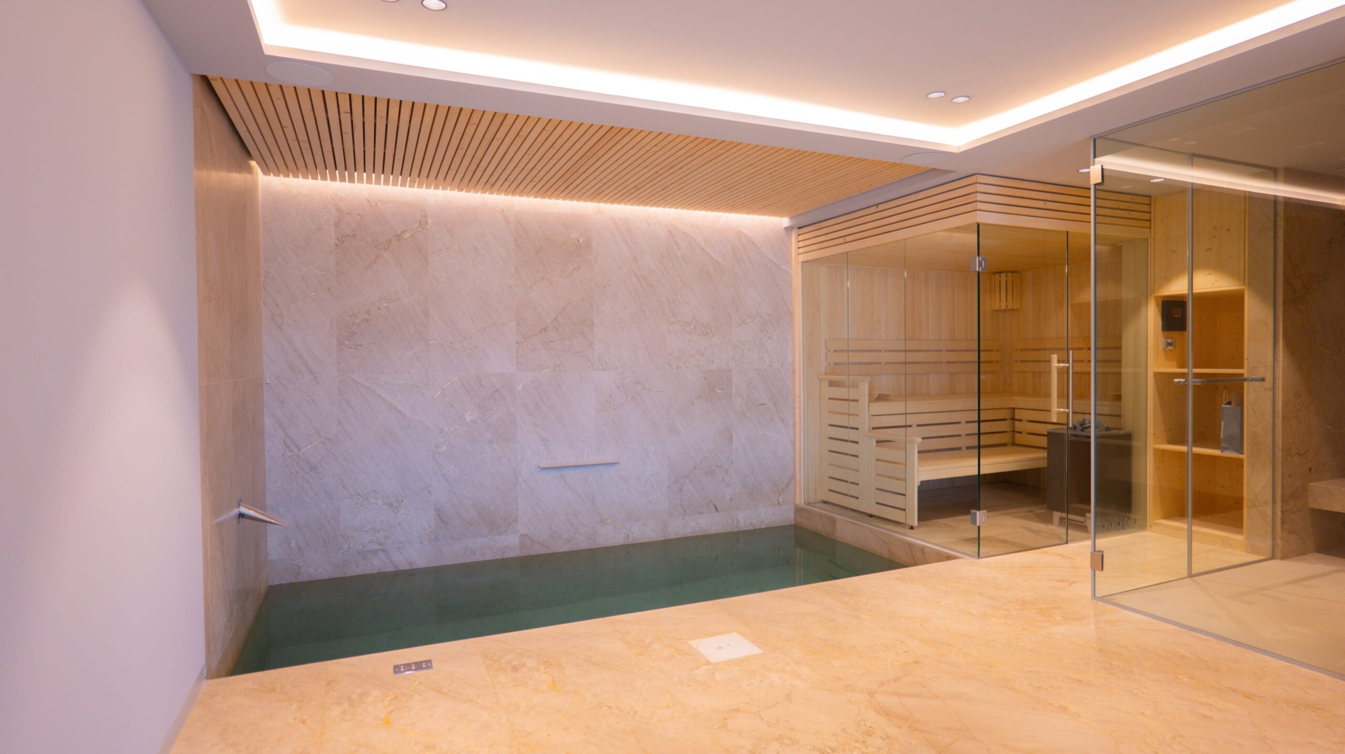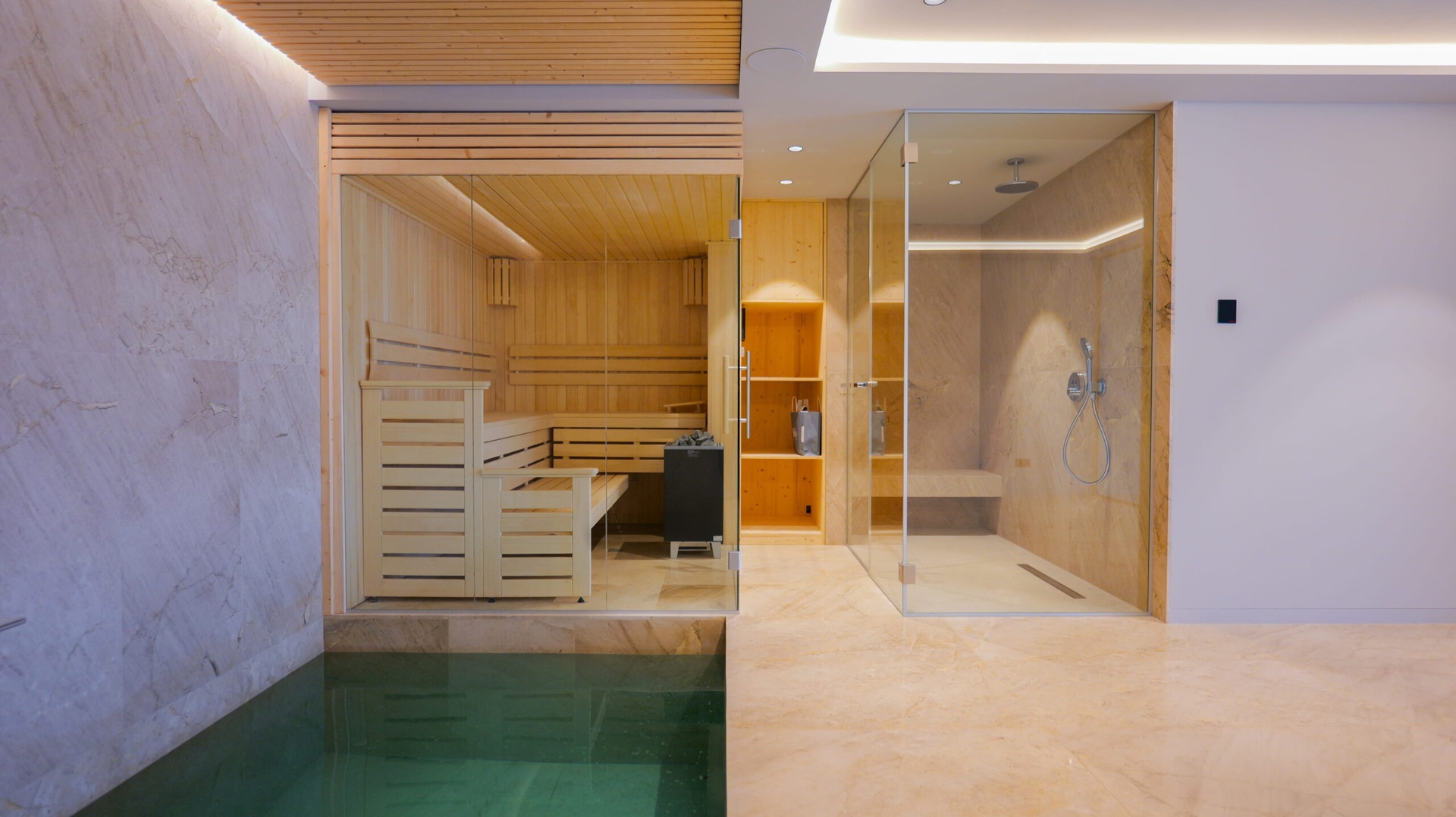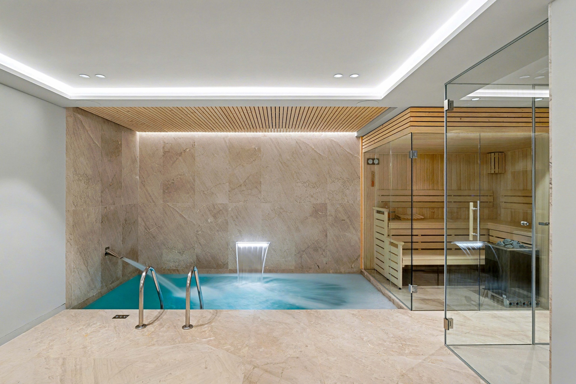 Indoor pool, gym, sauna, and steam room, creating a private spa environment within the home.