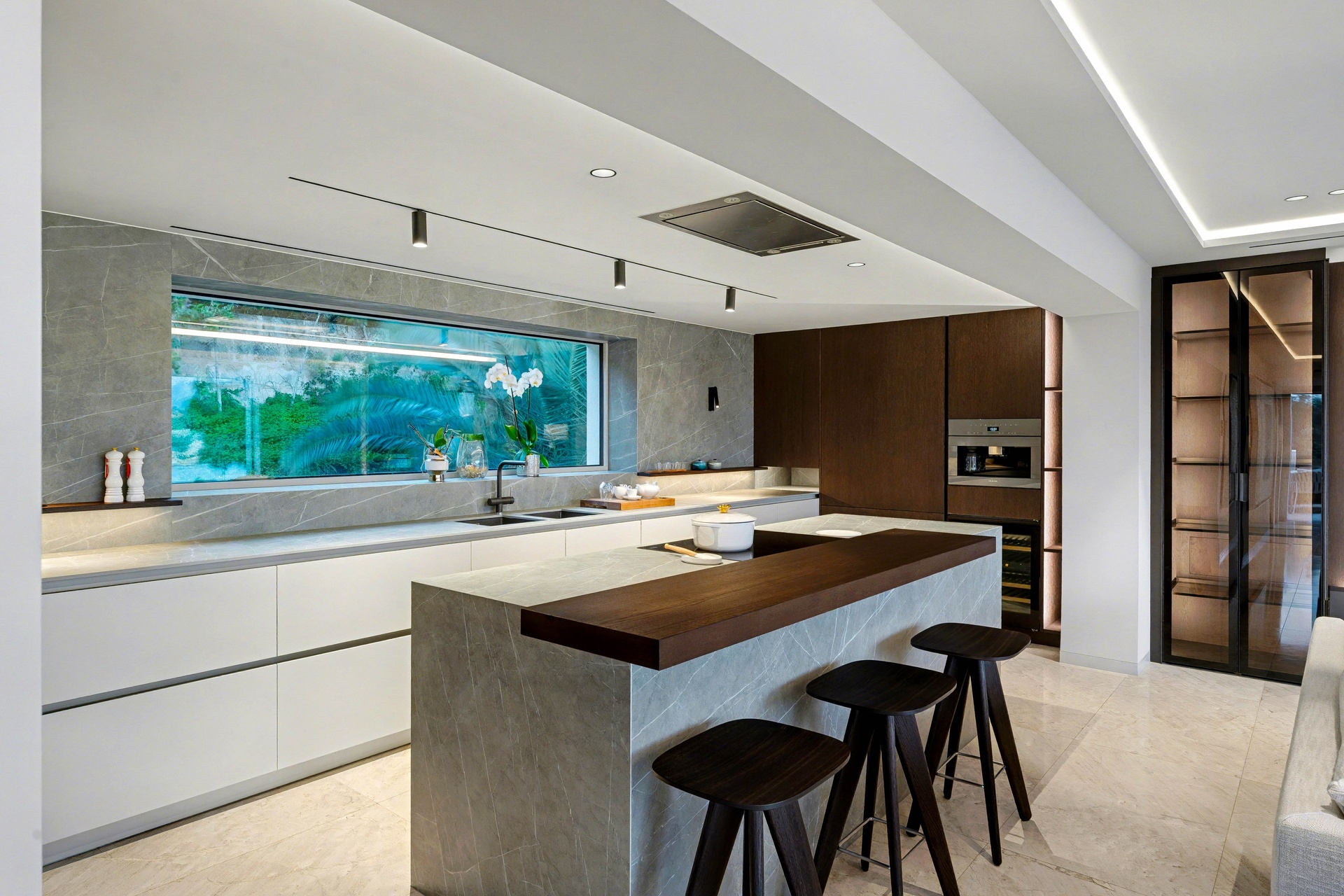 Sleek contemporary cabinetry, premium countertops, and an island ideal for entertaining.