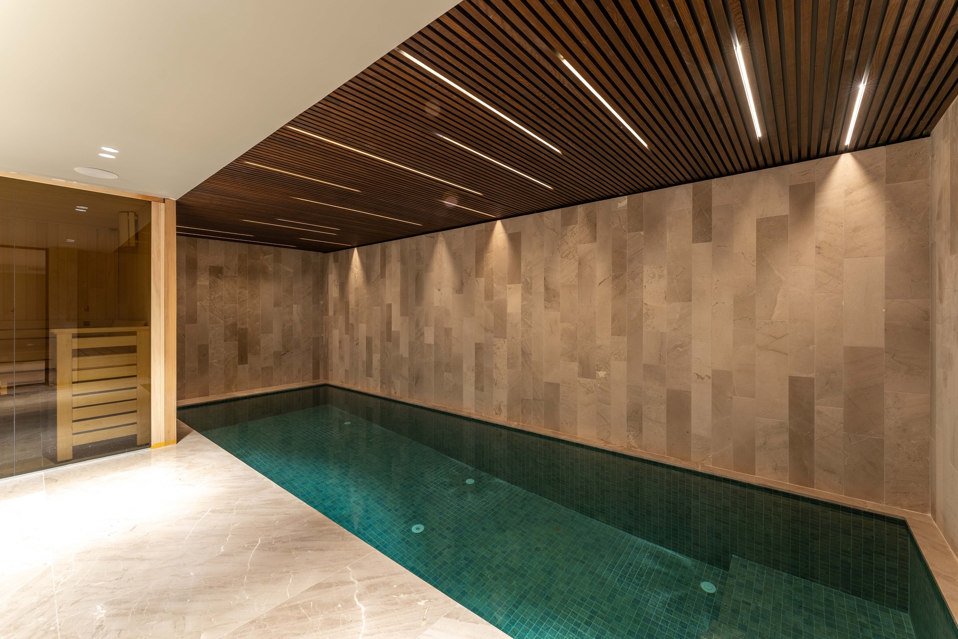 The lower level is dedicated to wellness and leisure, offering a private spa experience rarely found at this level. Features include an indoor heated pool, Swedish sauna, steam room, home gym, cinema room, and a temperature and humidity-controlled wine room — providing the ultimate lifestyle environment for year-round enjoyment.