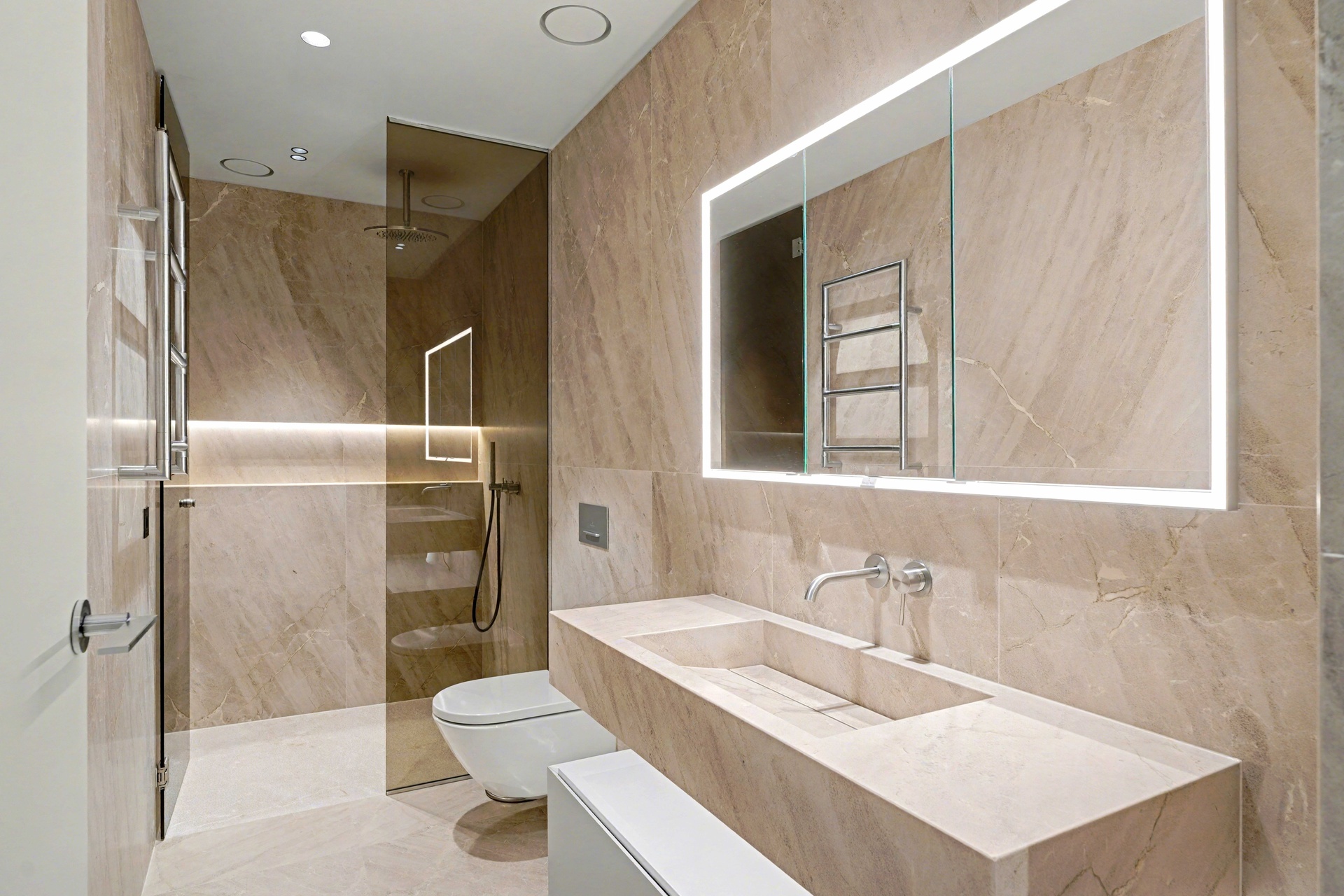 The accommodation comprises four generously proportioned en-suite bedrooms, all featuring bespoke built-in storage. The master suite enjoys its own private terrace and a beautifully appointed bathroom, creating a calm and luxurious retreat. A further guest suite with a walk-in wardrobe is located on the main living level, alongside a private home office.
