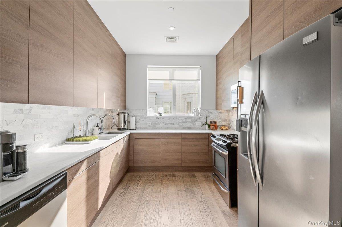 Discover beach side living in this luxury 2 family townhouse complex situated on the beach. Boasting contemporary design by renowned architect CetraRuddy, each townhouse offers spacious living areas, gourmet kitchens with double sinks, marble counters and backsplash with Porcelanosa fixtures, and private balconies and rooftops with breathtaking ocean views and to a private dock and beach access. This meticulously designed property features two distinct units. The lower unit offers two spacious bedrooms, a beautifully appointed bathroom, a Bosch washer-dryer, and an open-plan living area that flows seamlessly into a modern kitchen. The upper unit unfolds across three levels, creating an expansive triplex layout. On the main floor, an inviting living, dining, and kitchen space set the stage for elegant entertaining. There is also an additional room adjacent to the kitchen that can be used as a playroom or an office. Upstairs, there are three or four generously sized bedrooms and a bathroom, including a master suite with a luxurious en-suite bathroom. Ascend to the top level to discover a stunning rooftop terrace, offering panoramic views of the coastline-a serene retreat for relaxation and gatherings. This townhouse also features a garage with two storage rooms, ensuring ample space and convenience. This extraordinary property not only promises unparalleled comfort and sophistication but also presents a unique investment opportunity with dual residences, each offering its own distinctive charm and functionality. Whether as a private oasis or an income-generating asset, this luxury townhouse embodies the pinnacle of beachfront living.