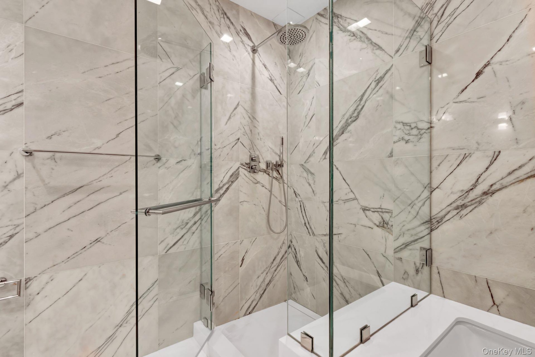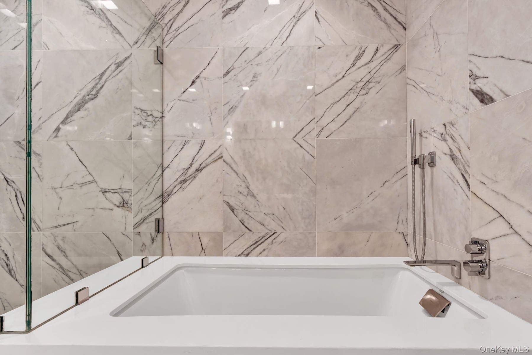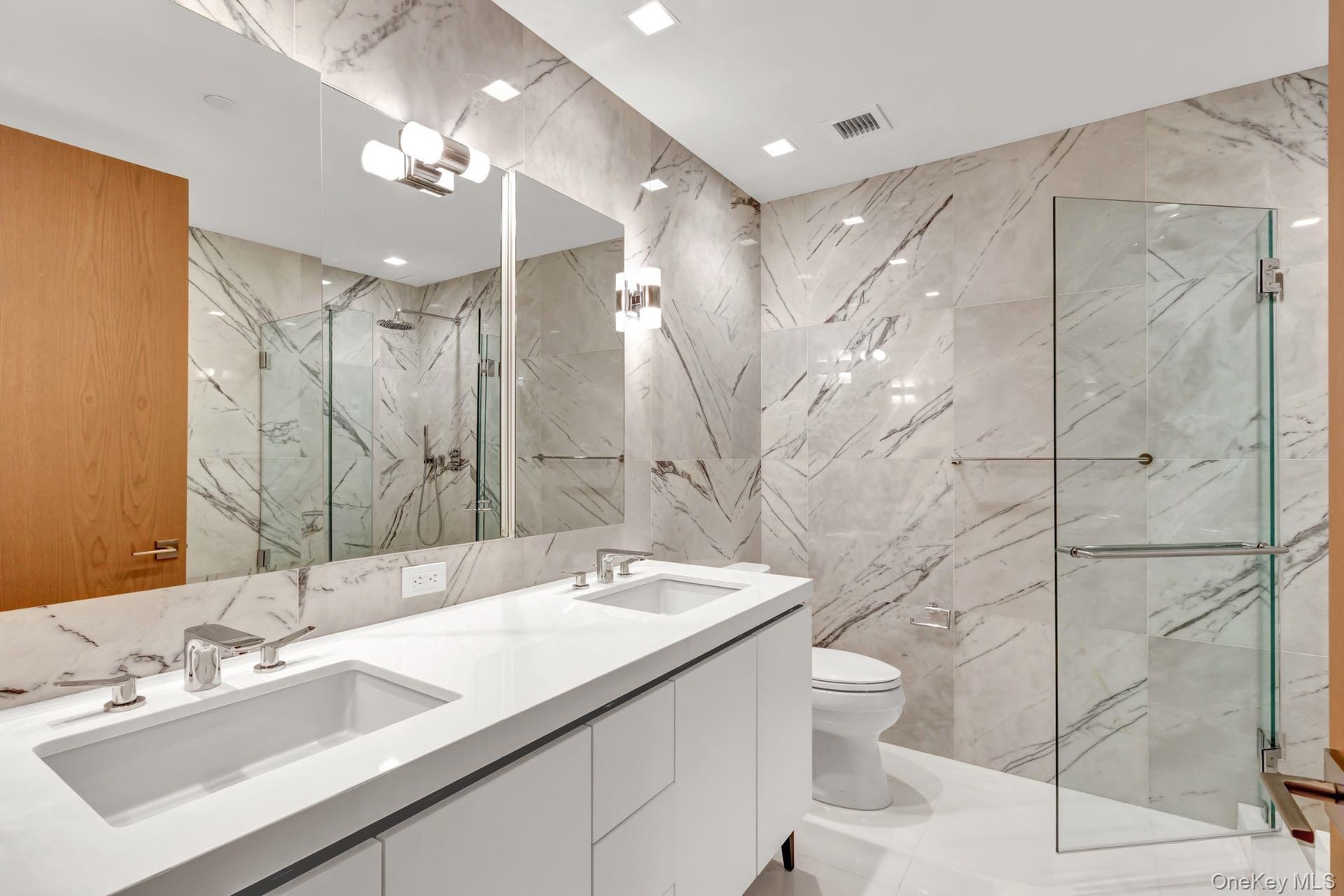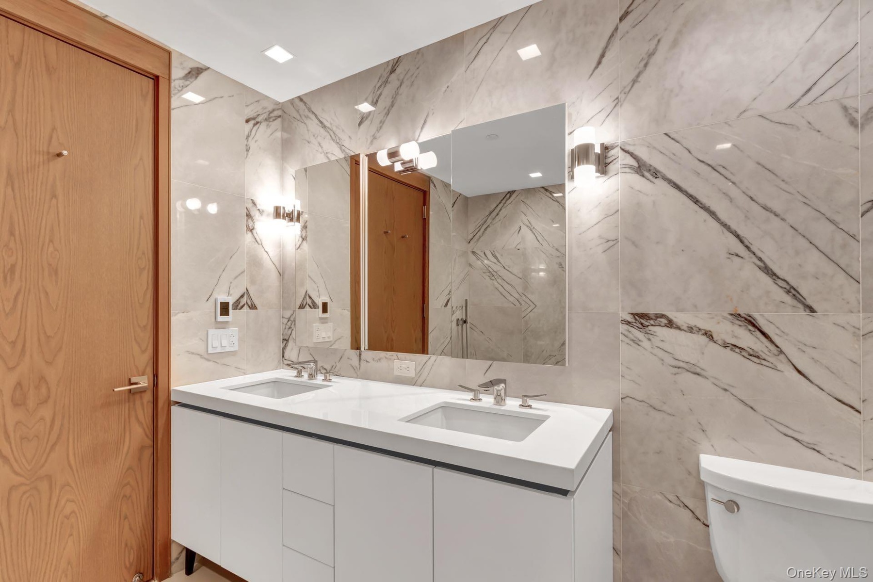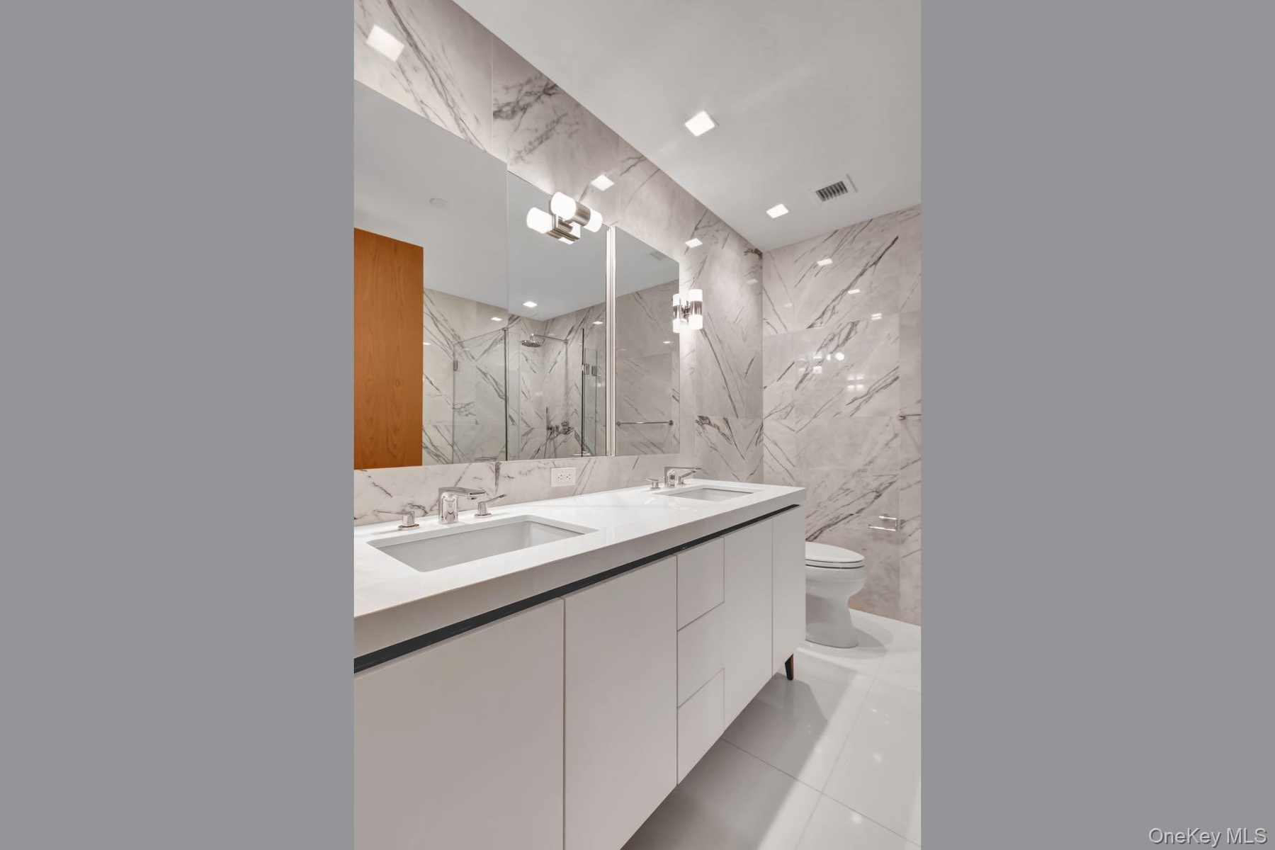 Each of the two bathrooms features radiant heated flooring and sensuous materiality. The lavish ensuite primary bath is encased in Turkish Lilac marble walls, dual custom RiFRA vanities, and Dornbracht fittings and fixtures throughout. The secondary bathroom features polished white stone floors and a custom RiFRA vanity with Dornbracht fittings and fixtures. Both bedrooms, each sporting eastern exposure, are larger than the average sleeping space, with a cavernous walk-in closet in the primary suite and a modern organized closet in the second bedroom. A Miele Prestige washer & dryer, state-of-the-art Daikin heating and cooling system, and motorized shades on all windows in all rooms complete this outstanding residence.
