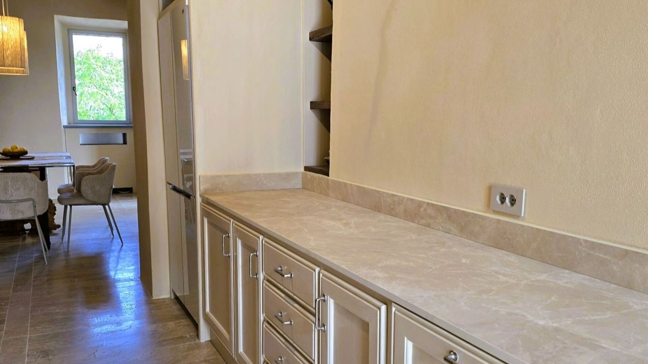 The bathrooms will feature elegant marble finishes and the kitchen will be embellished with travertine shelves.