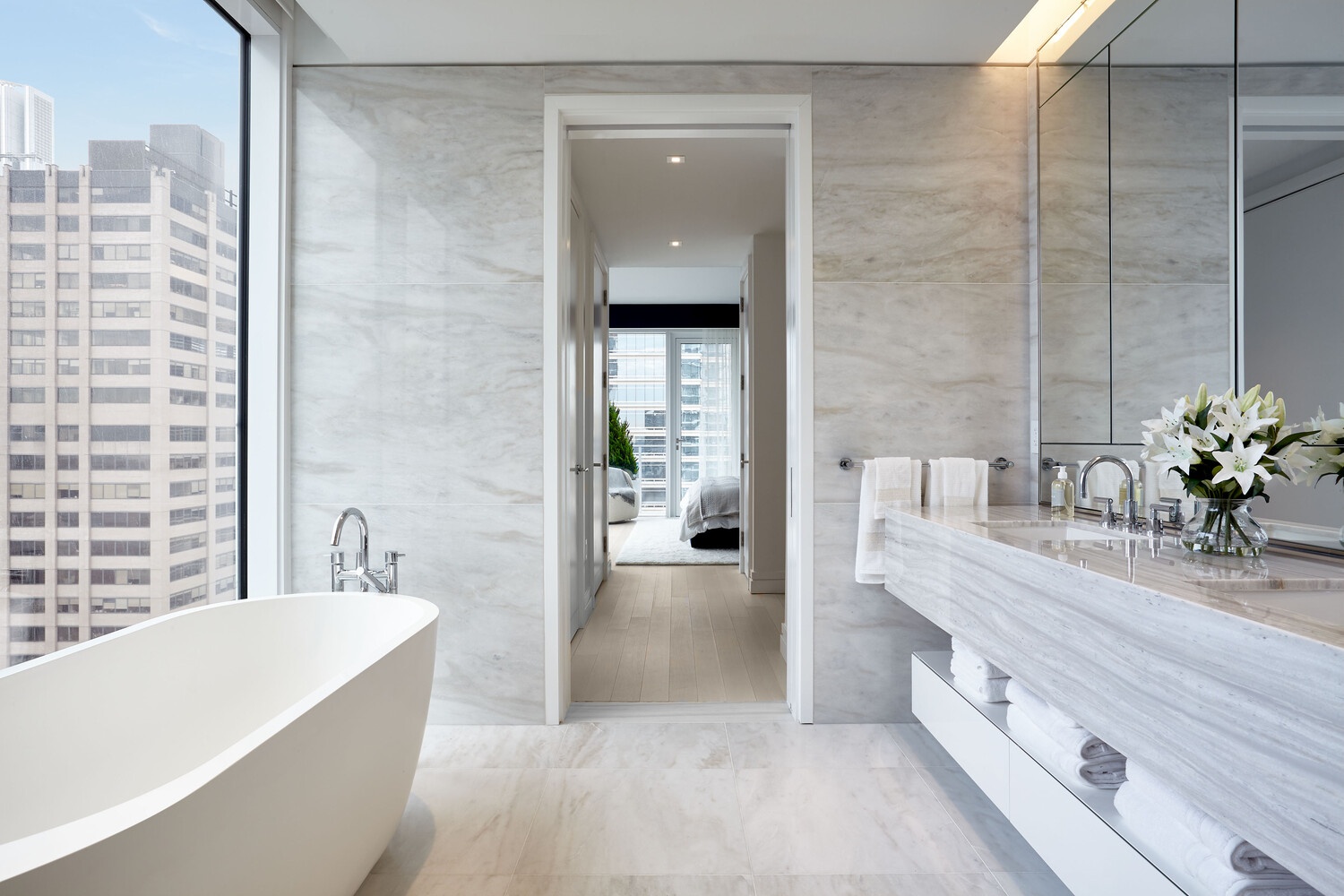 The expansive, corner primary bedroom features south and west city views, with three spacious closets and a luxurious en-suite primary bath clad with Siberian white polished marble walls and honed marble floors with radiant heating. A floating vanity is crafted from Siberian mink polished marble, fixtures by Watermarks contemporary Loft 24 Collection in a polished chrome finish, and a spa-like floor-to-ceiling glass enclosed rain shower with thermostatic controls along with a freestanding deep-soaking bathtub. Wall-mounted toilets are by Toto.