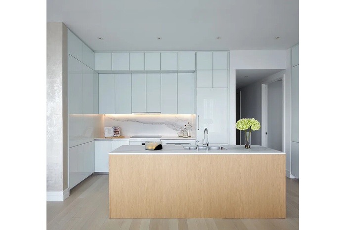 The 571 square-foot terrace seamlessly connects the great room to an open kitchen outfitted with Italian white glass and aluminum trim cabinetry by Aran Cuchine, book matched honed Calacatta marble slab countertops, a natural white oak island and full-height backsplashes, and integrated Brilliant White glass appliances by Miele including an integrated wine refrigerator.