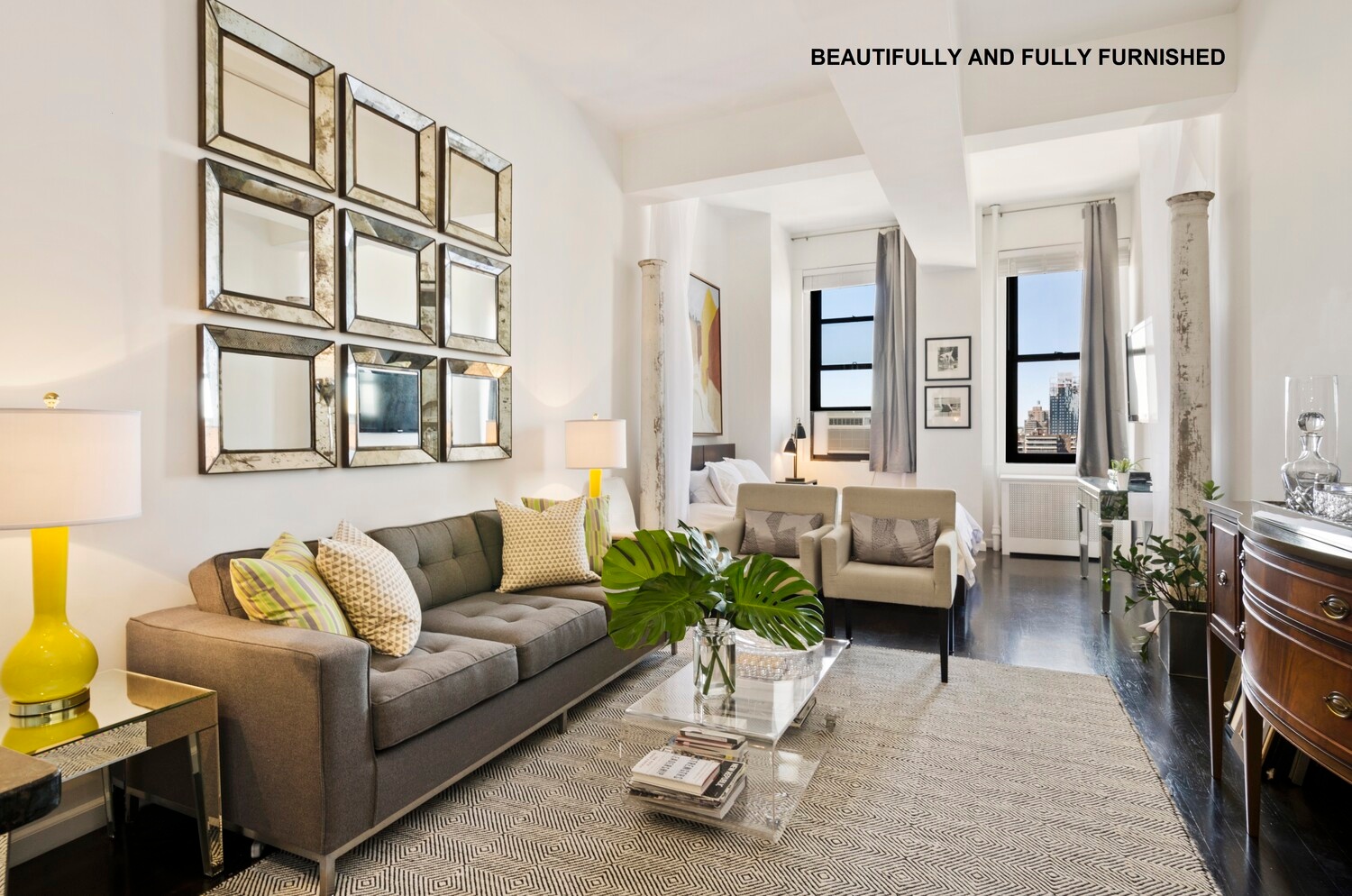 Stunning, fully furnished high-floor studio loft in boutique prewar building with million-dollar views and breathtaking sunsets! Pamper yourself with a luxuriously furnished, beautifully renovated sun-drenched home with 11-ft beamed ceilings, sleek open kitchen with granite counters and stainless steel appliances, elegant renovated bath, gorgeous espresso hardwood floors, great closet space, beautiful natural light, and an airy, warm, elegant feel. Fully equipped with dishes, flatware, fresh linens/towels, and a Nespresso machine to start your morning off right! Appointed with sophisticated high-end furnishings, this apartment truly has the look and feel of a designer showcase. Enjoy the convenience of the best Chelsea location--the subway (#1 line) is right on the corner at 28th St, and Whole Foods, Trader Joes, the Highline, Penn Station, and great nightlife, dining, and shopping all outside your door. Available only for short-term lease from January-April 2026.