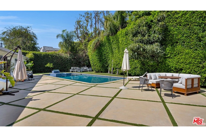 An extraordinary opportunity to live in a Beverly Hills Flats estate, perfectly situated just moments from the iconic Waldorf Astoria and Rodeo Drive. Set on a generous flat lot, this private property offers an impressive combination of scale, quality, and comfort across a main residence and a fully equipped back house totaling 7 bedrooms and 6.5 baths. Step inside the two story foyer and experience timeless elegance highlighted by mahogany doors and windows, hardwood flooring, and beautifully crafted architectural details, with sunlight pouring through the windows to create a bright and inviting ambiance throughout the home. The kitchen opens directly to a warm and spacious living area anchored by a classic fireplace, ideal for everyday enjoyment or hosting guests. Upstairs, you will find four ensuite bedrooms including a refined primary suite featuring a gorgeous fireplace, a large private balcony overlooking the lush grounds, dual walk in closets, and a spa inspired bathroom with dual vanities, a soaking tub, and an oversized shower. The lower level is thoughtfully designed for entertainment and versatility, offering a generous media and lounge area, a dedicated office, one bedroom, a full bathroom, a powder room, and abundant storage. The backyard feels like a resort, complete with a pool and spa, beautifully landscaped gardens, and a detached guest house with two bedrooms, two baths, its own kitchen, and a built in bar, perfect for guests, long term stays, creative use, or staff accommodations. Mature landscaping surrounds the property, creating a serene setting ideal for relaxation and entertaining.