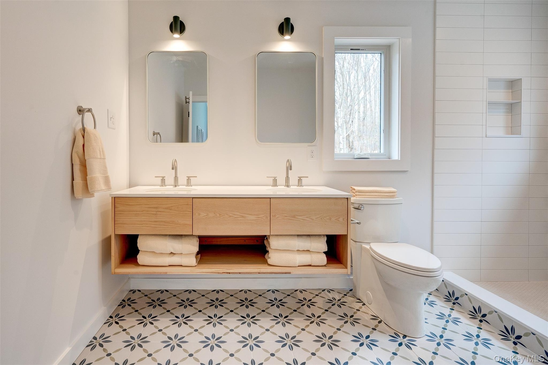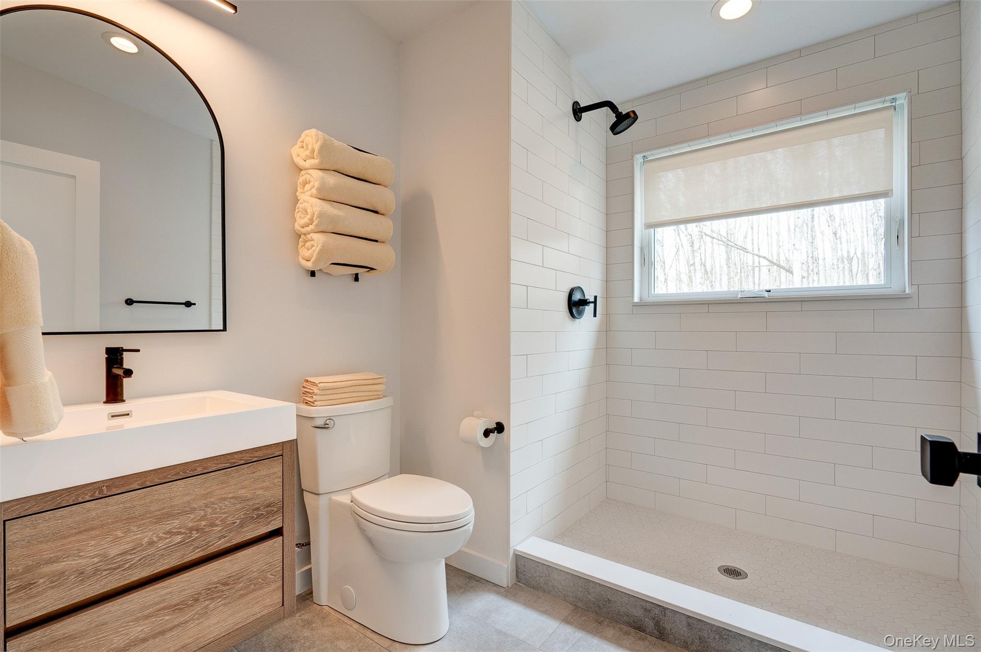 The house, completed in 2022, comes move-in ready, with quality furnishings, linens, towels, and a well-stocked kitchen. Three bedrooms and three baths provide comfortable space for guests, while the main living area centers around a wood-burning fireplace that anchors the home on cooler evenings. The kitchen has quartz counters, a handy peninsula, and a view out to the lake. The primary bedroom has a high, vaulted ceiling and a killer bathroom with a huge, beautifully tiled shower.