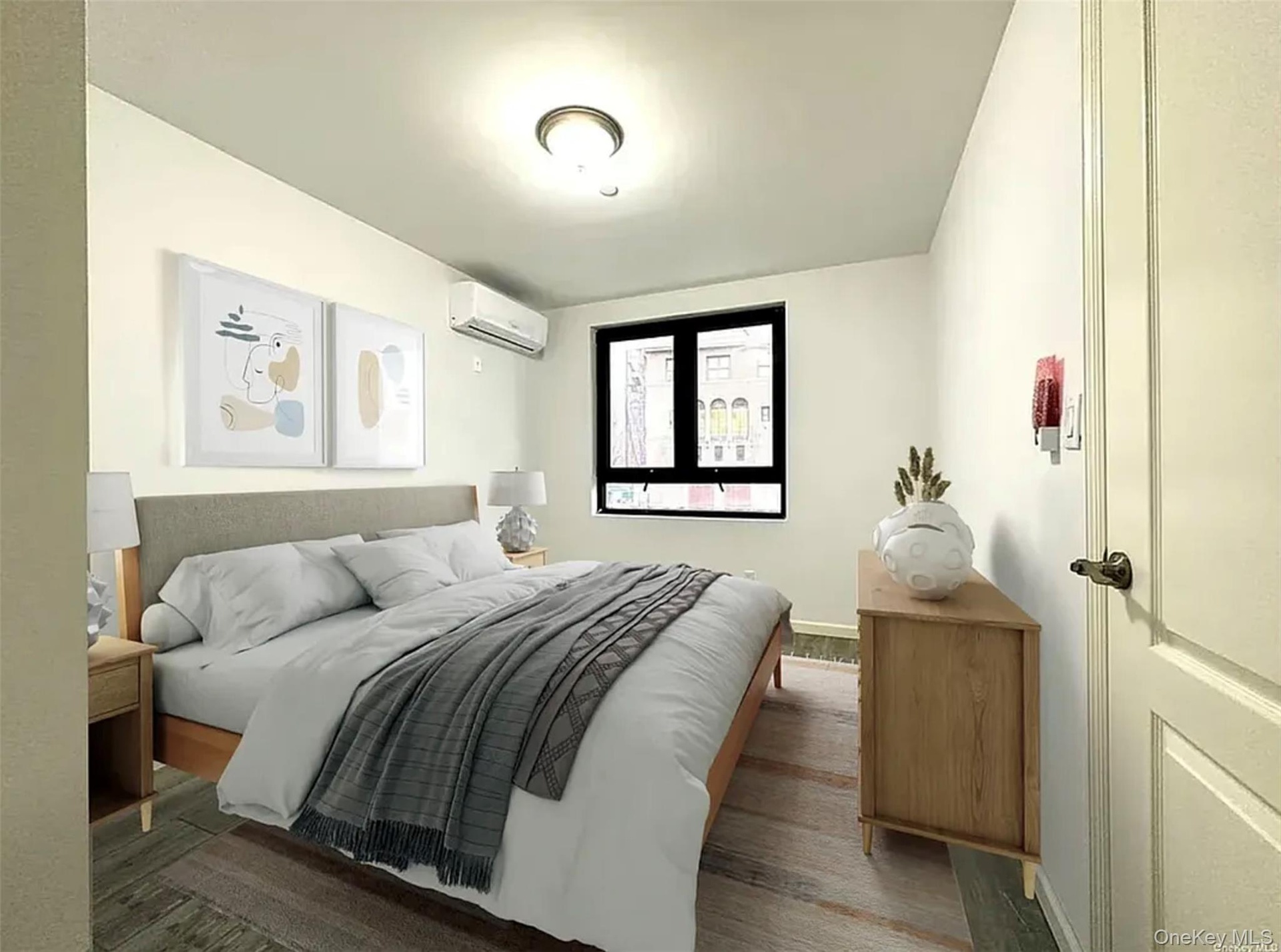 - Bedroom featuring wood finished floors and a wall mounted AC