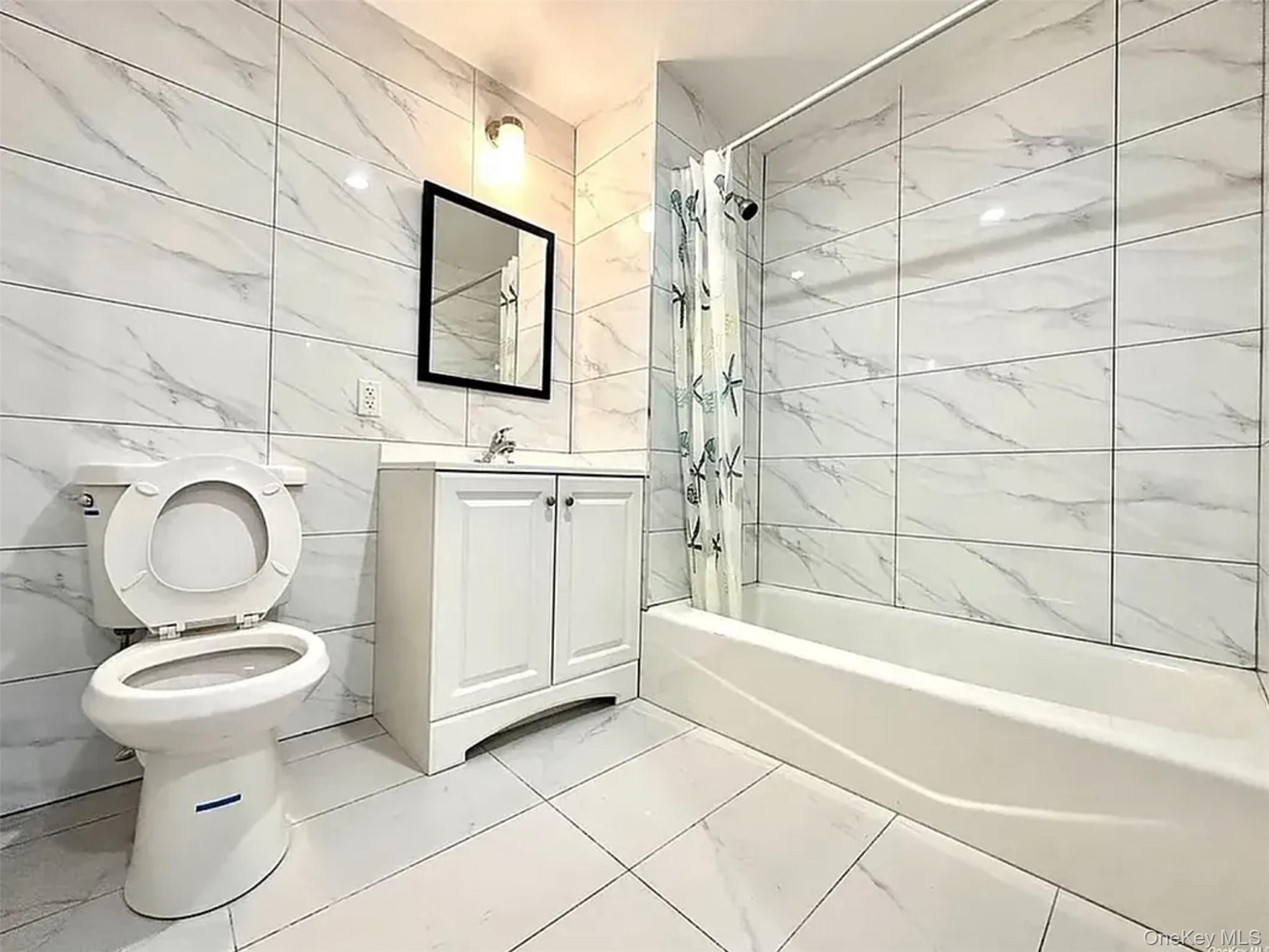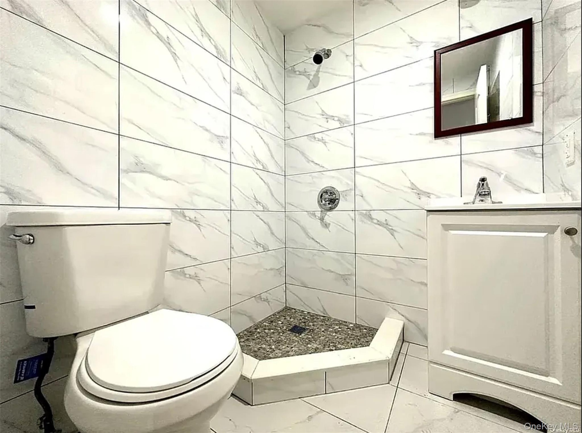 - Full bathroom featuring a shower stall, vanity, tile walls, and marble look tiles