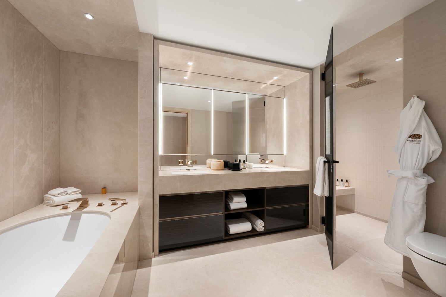 The primary bedroom suite is furnished with a king-size bed, smartly designed built-in desk, and ample storage. The en-suite primary bathroom features a dual vanity, oversized soaking tub, and a luxurious steam shower.