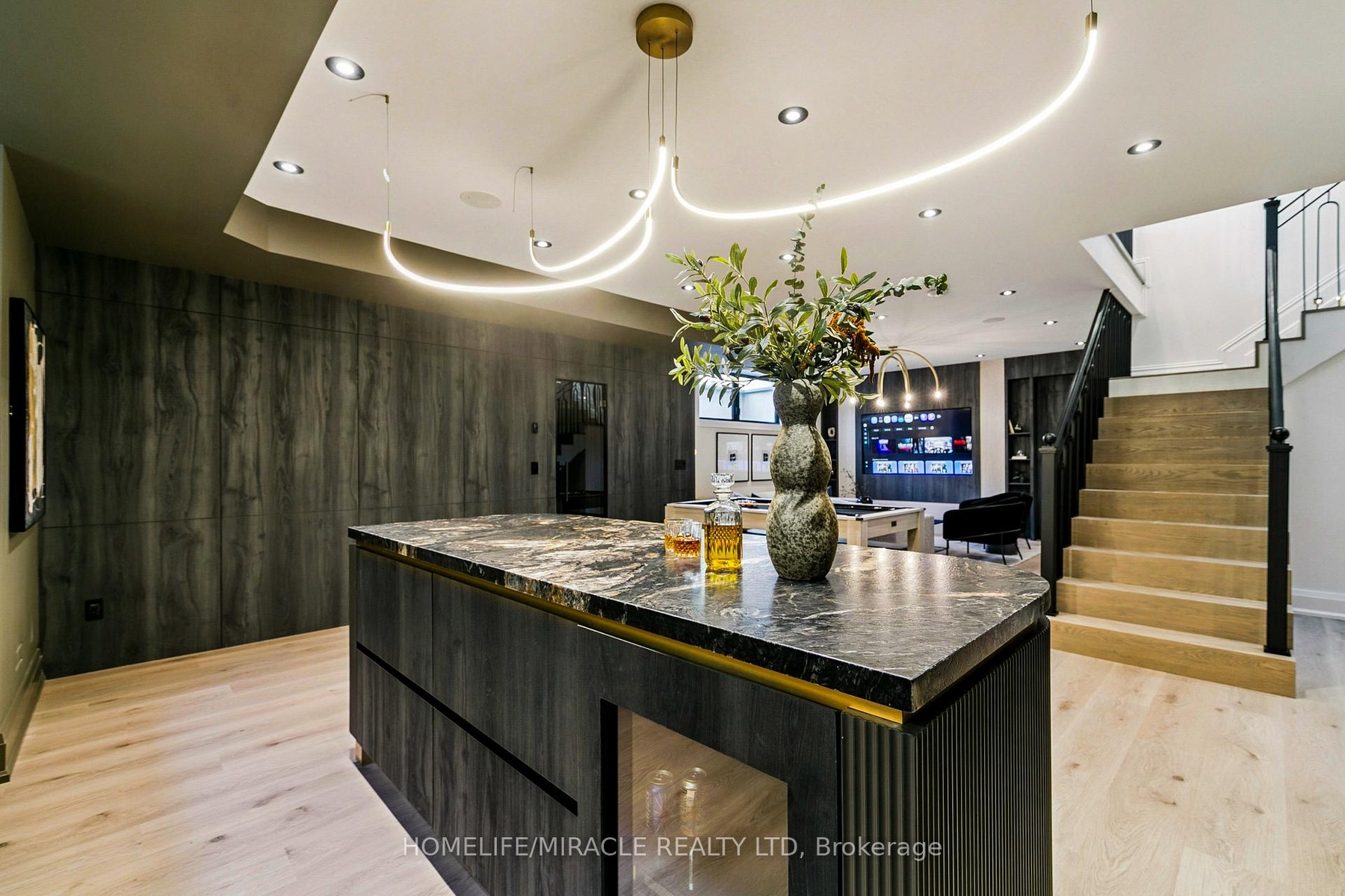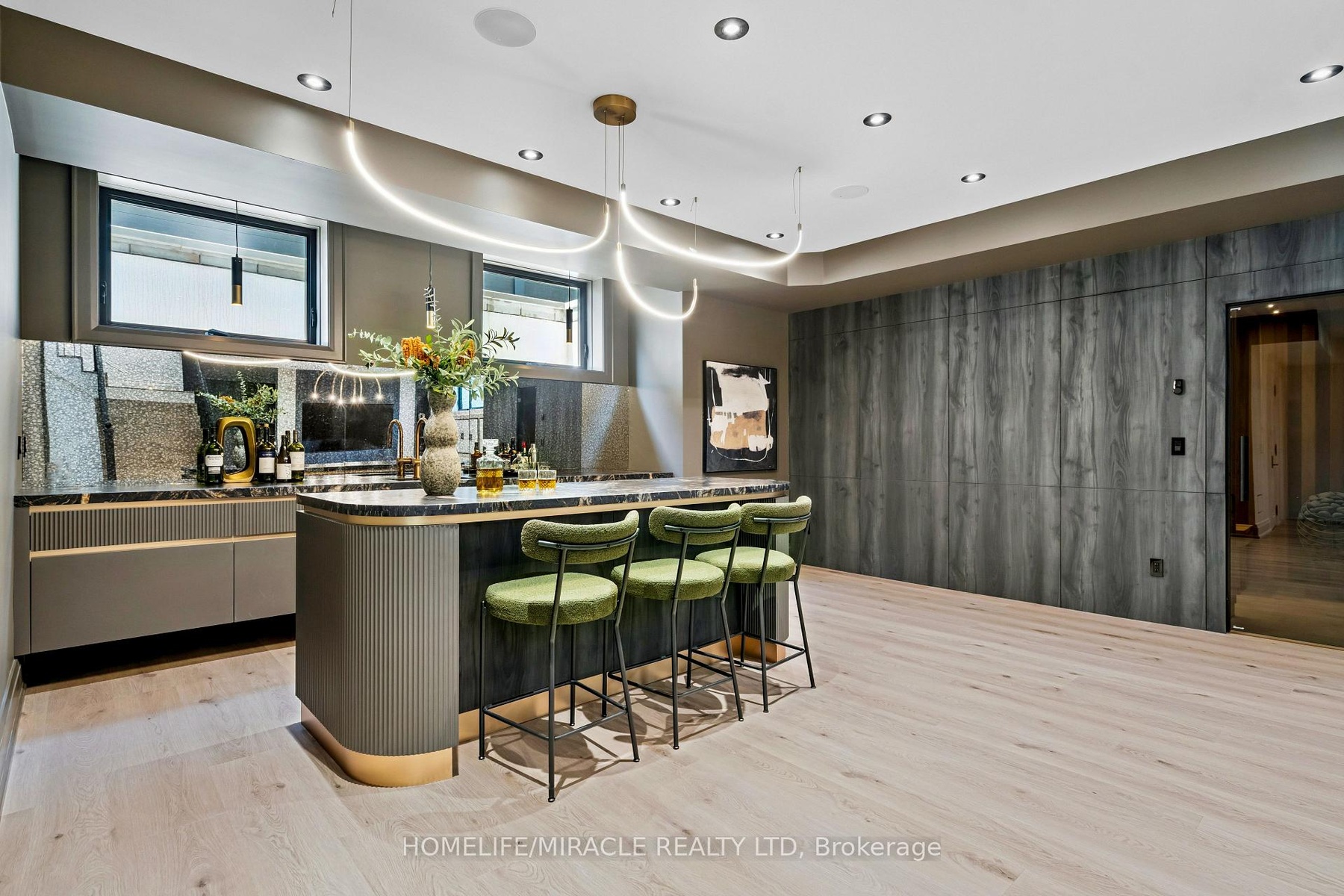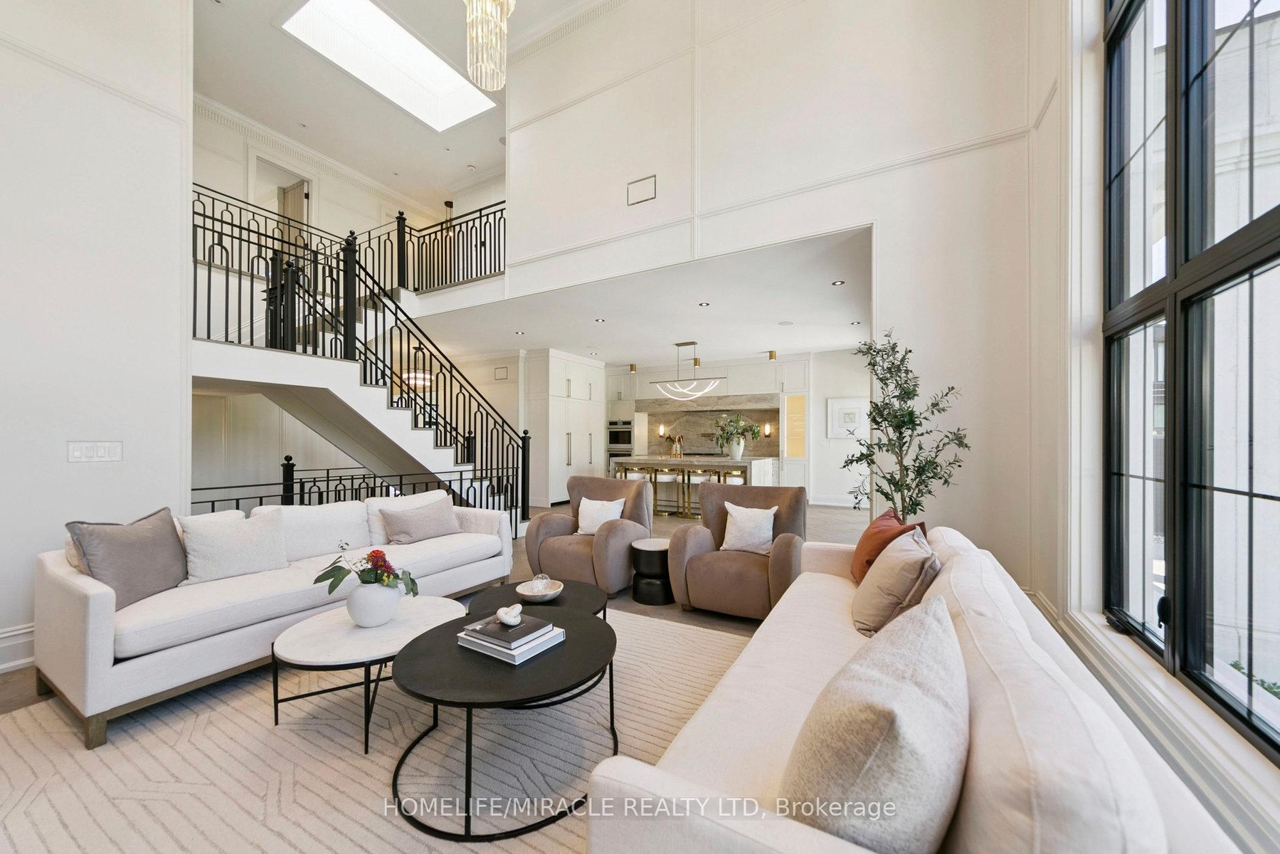 Welcome to 517 Stafford Drive, an architectural masterpiece in the heart of Oakville where luxury, innovation, and comfort unite. Step through a large custom entry door into a bright foyer finished with elegant ceramic tile and custom lighting, leading to a main floor defined by modern sophistication. Every room features built-in speakers and a fully integrated smart-home system for effortless control of lighting, climate, sound, and security. The formal dining room dazzles with a dramatic chandelier and wine display wall, while the sleek home office offers custom shelving and LED lighting. The chef's kitchen showcases full-height cabinetry, integrated appliances, and a Taj Mahal natural stone waterfall island accented with brass fixtures. The open-concept great room impresses with 20-foot ceilings, a striking marble fireplace, and surround sound. Upstairs, the primary suite is a serene retreat with a spa-inspired ensuite, dual vanities, a freestanding tub, and smart lighting. Additional bedrooms include custom closets and private ensuites. The lower level offers a state-of-the-art home theatre, glass-enclosed gym, recreation room, designer wet bar, and cedar sauna for a spa-like experience. Outside, professionally landscaped grounds provide privacy and tranquility. Minutes from Oakville's premier amenities, residents enjoy proximity to Upper Oakville Shopping Centre, Oakville Place, Farm Boy, Whole Foods, and Metro, with parks and trails nearby. Top-ranked schools-Appleby College, Abbey Park High School, and Iroquois Ridge High School-are close at hand. Perfectly located, beautifully finished, and intelligently designed, 517 Stafford Drive is more than a home-it's a refined, connected way of life.