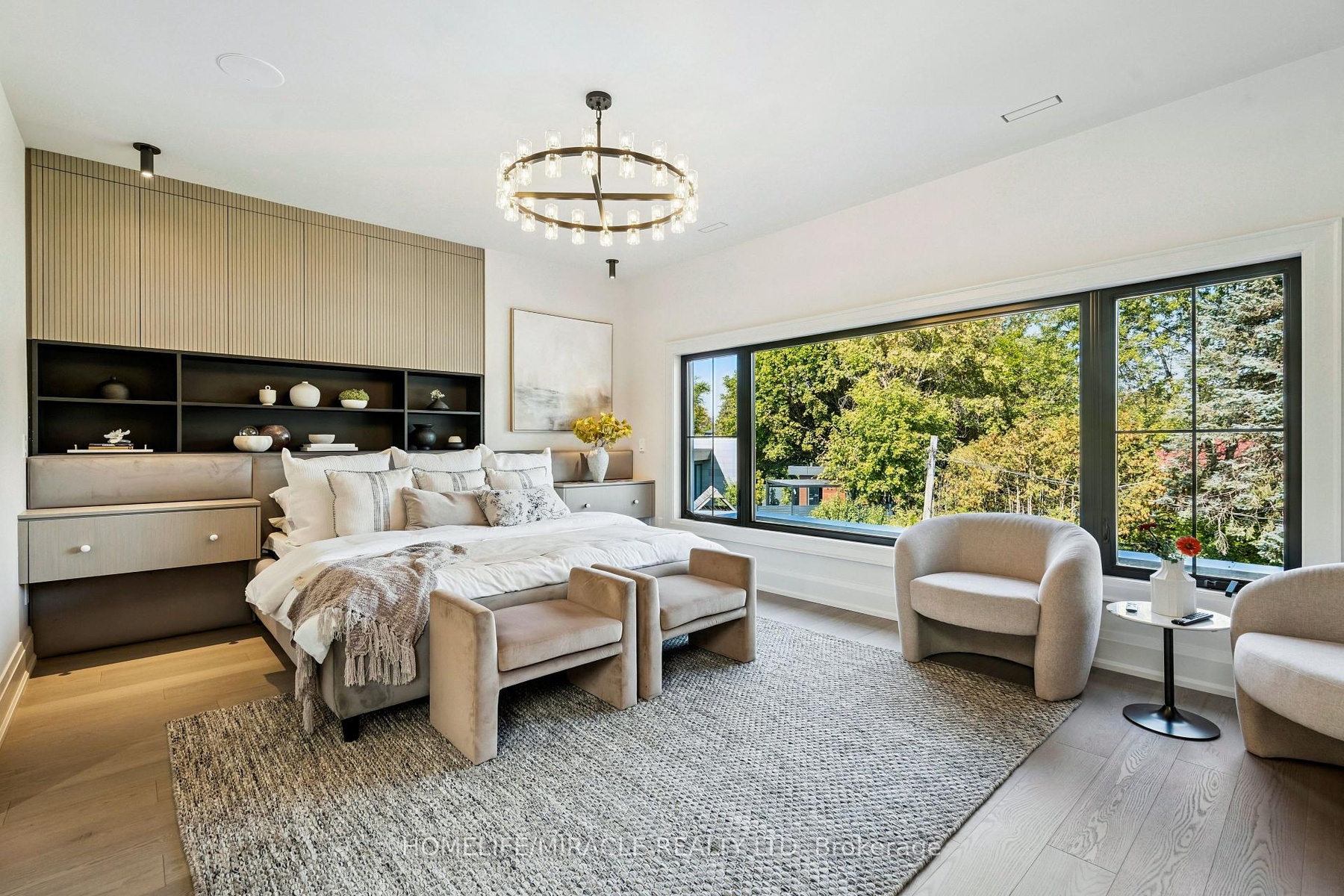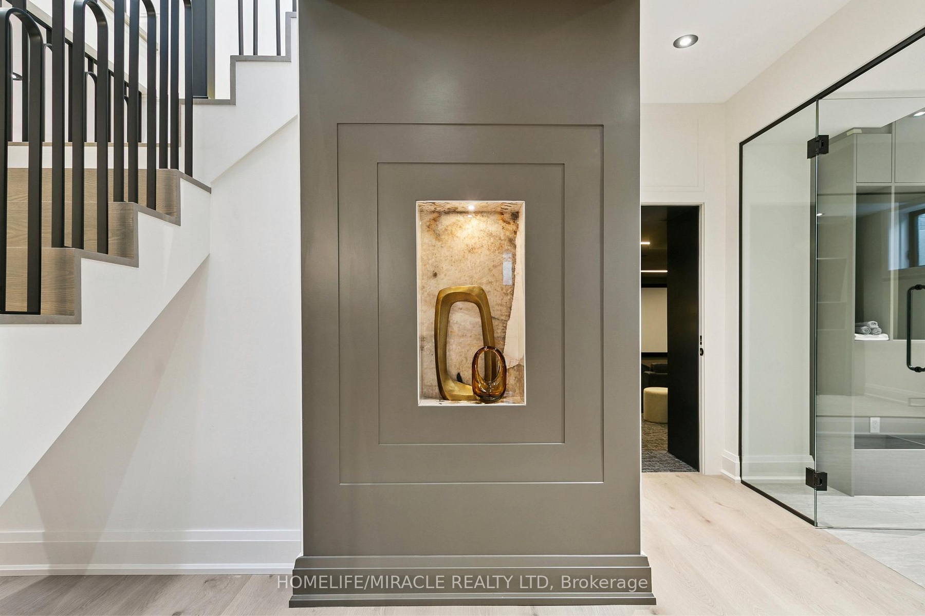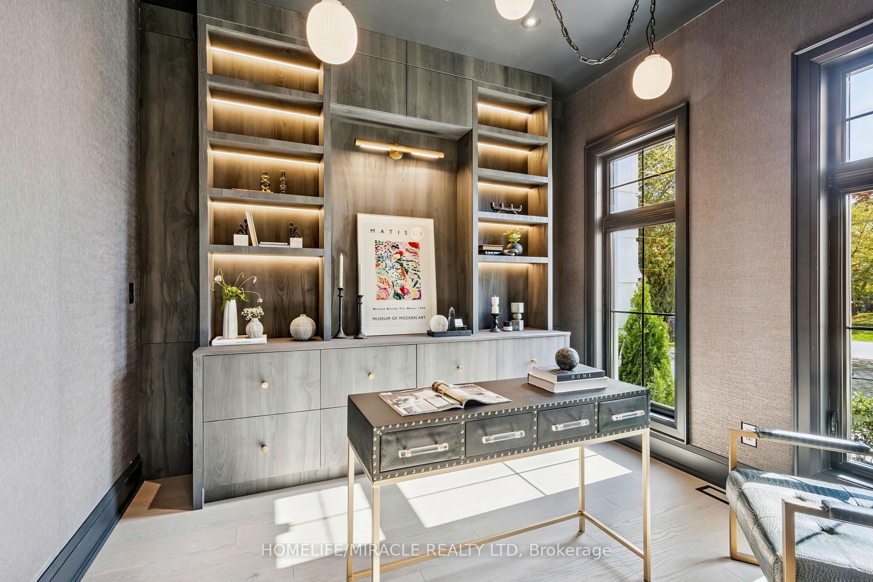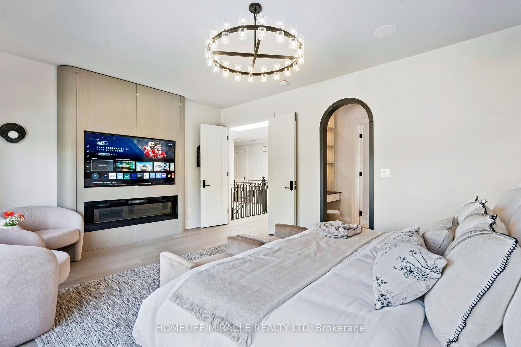 Welcome to 517 Stafford Drive, an architectural masterpiece in the heart of Oakville where luxury, innovation, and comfort unite. Step through a large custom entry door into a bright foyer finished with elegant ceramic tile and custom lighting, leading to a main floor defined by modern sophistication. Every room features built-in speakers and a fully integrated smart-home system for effortless control of lighting, climate, sound, and security. The formal dining room dazzles with a dramatic chandelier and wine display wall, while the sleek home office offers custom shelving and LED lighting. The chef's kitchen showcases full-height cabinetry, integrated appliances, and a Taj Mahal natural stone waterfall island accented with brass fixtures. The open-concept great room impresses with 20-foot ceilings, a striking marble fireplace, and surround sound. Upstairs, the primary suite is a serene retreat with a spa-inspired ensuite, dual vanities, a freestanding tub, and smart lighting. Additional bedrooms include custom closets and private ensuites. The lower level offers a state-of-the-art home theatre, glass-enclosed gym, recreation room, designer wet bar, and cedar sauna for a spa-like experience. Outside, professionally landscaped grounds provide privacy and tranquility. Minutes from Oakville's premier amenities, residents enjoy proximity to Upper Oakville Shopping Centre, Oakville Place, Farm Boy, Whole Foods, and Metro, with parks and trails nearby. Top-ranked schools-Appleby College, Abbey Park High School, and Iroquois Ridge High School-are close at hand. Perfectly located, beautifully finished, and intelligently designed, 517 Stafford Drive is more than a home-it's a refined, connected way of life.