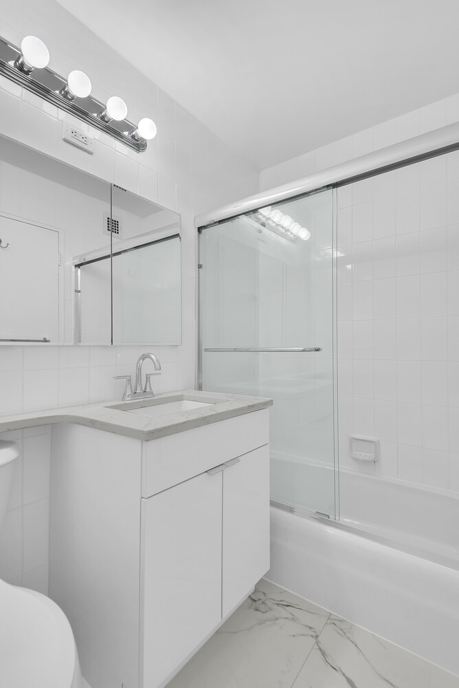 The king-size bedroom has a wall of reach-in closets and easy access to a separate dressing area with abundant closets and a lovely renovated bathroom with a tub and sliding glass shower doors.