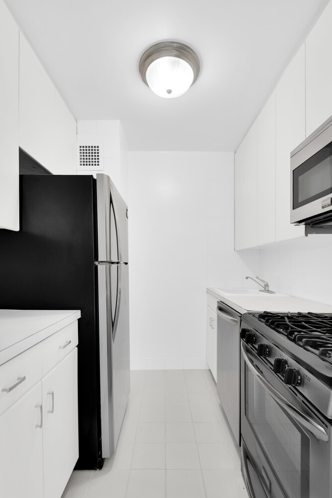 Oversized windows offer classic city vistas, and new floors and efficient thru-wall cooling units run throughout. The galley-style kitchen includes ample cabinetry and full-size stainless-steel appliances.