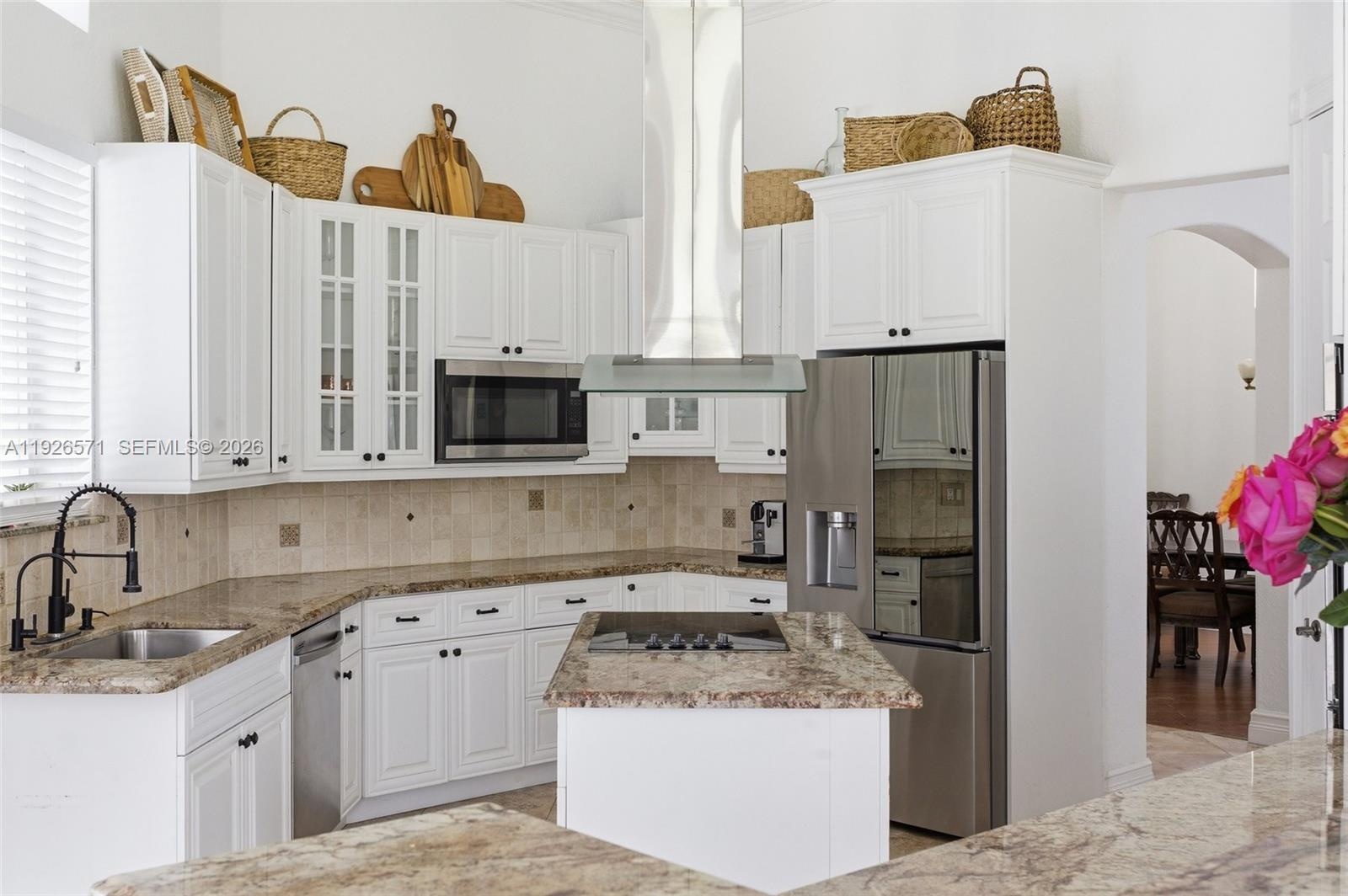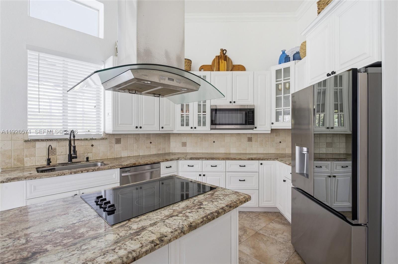 The split 5-bedroom, 4-bath layout is anchored by a grand primary suite and complemented by one additional flexible room ideal for a private office, gym, studio, or conversion into extra bedrooms. Soaring 12-foot ceilings elevate the ambiance across the elegant family room, breakfast area, and chef’s kitchen appointed with wood cabinetry, granite countertops, stainless steel appliances, an LG refrigerator, a Bosch double wall oven, and a generous island.