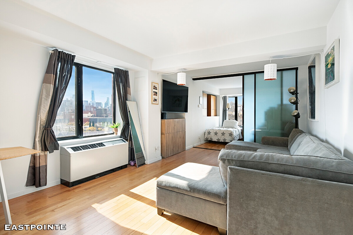 Residence 10D is a spacious 1BR loft style condo with a sleek interpretation of quintessential New York City living. An open floorplan maximizes space and natural light while contemporary finishes like hardwood floors and double-paned windows bring a level of sophistication and refinement to a neighborhood known for its vibrant spirit and gritty attitude. The kitchen is equipped with clean white cabinetry and a suite of stainless steel appliances from Bosch and Fisher & Paykel. The bathroom has been recently renovated and features subway-tiled walls and an easy-to-clean tile floor. A GE washer/dryer is also conveniently included as part of the apartment. Designed by OTL Enterprises the same firm whose passion and vision were behind The Blue Building of the Lower East Side. The Calyx is a full service condominium offering 35 residences dressed with groomed interiors, a fitness facility and a rooftop lounge boasting panoramic views of Manhattan. Pairing sophistication with the spirit of the East Village. The building rises 10 stories and sits on Avenue C, an East Village strip lined with tasteful restaurants and cafes and located only a few blocks away from Tompkins Square Park and popular nightlife scenes. The Calyx is for those seeking to capture the energy of an evolving neighborhood, to experience the edge of the city's past and the shimmering promise of its future. Nearby public transportation include the L train.