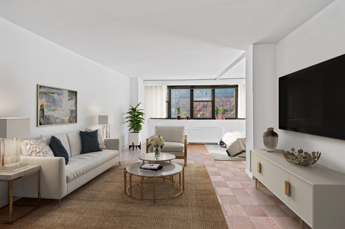 Step into this bright and airy alcove studio, highlighted by a wide bank of south-facing windows that bathe the home in natural light all year long. The generously sized sleeping alcove easily accommodates a queen-size bed with nightstands, while the classic parquet flooring adds warmth and character throughout. There’s ample room to create a separate dining area, and the well-designed galley kitchen offers excellent counter space and abundant cabinetry.