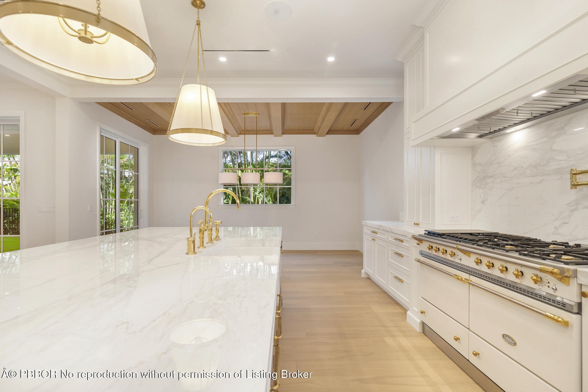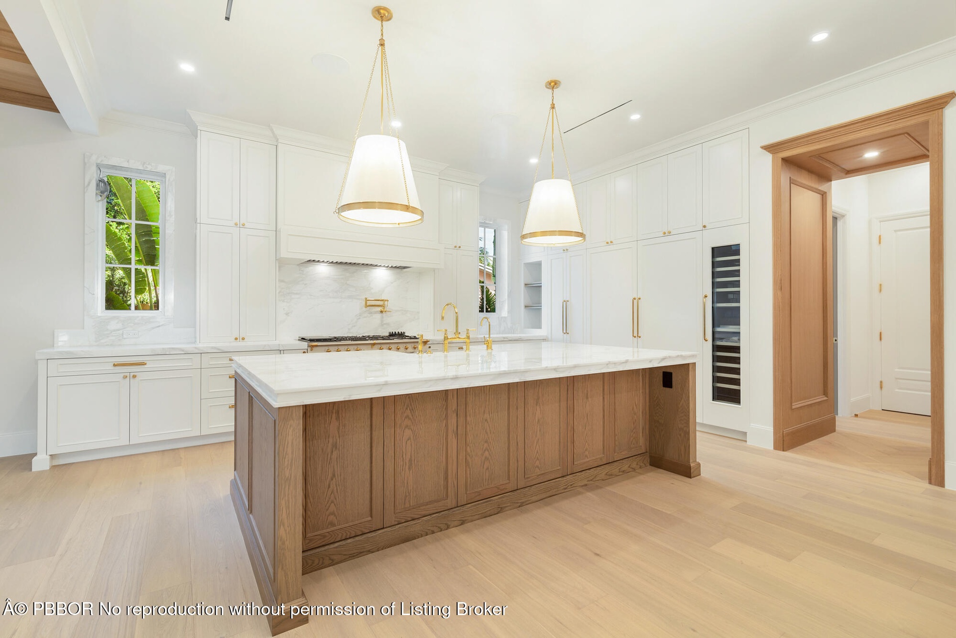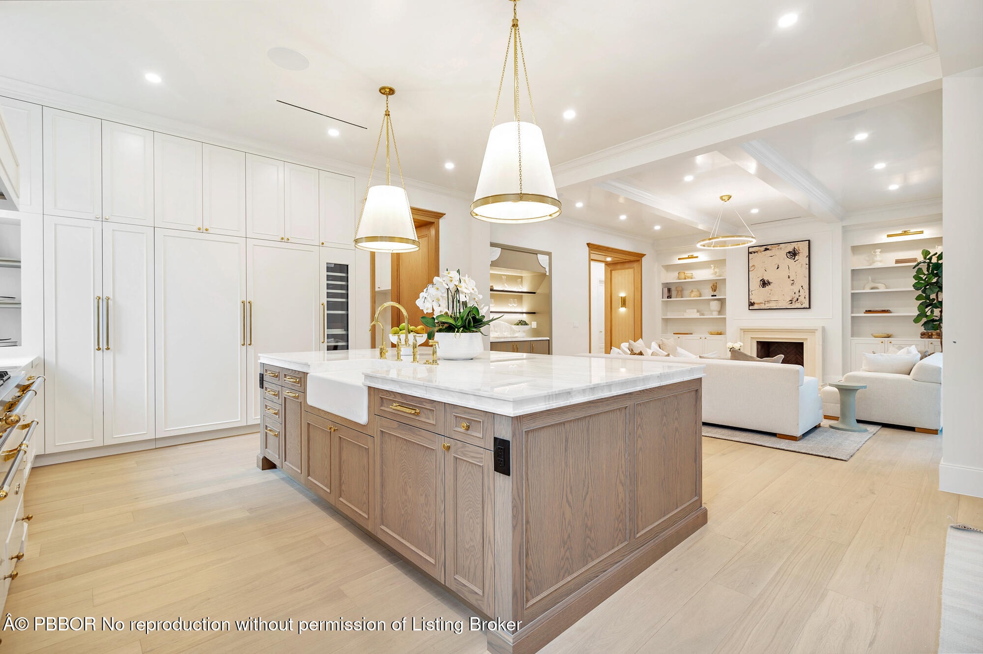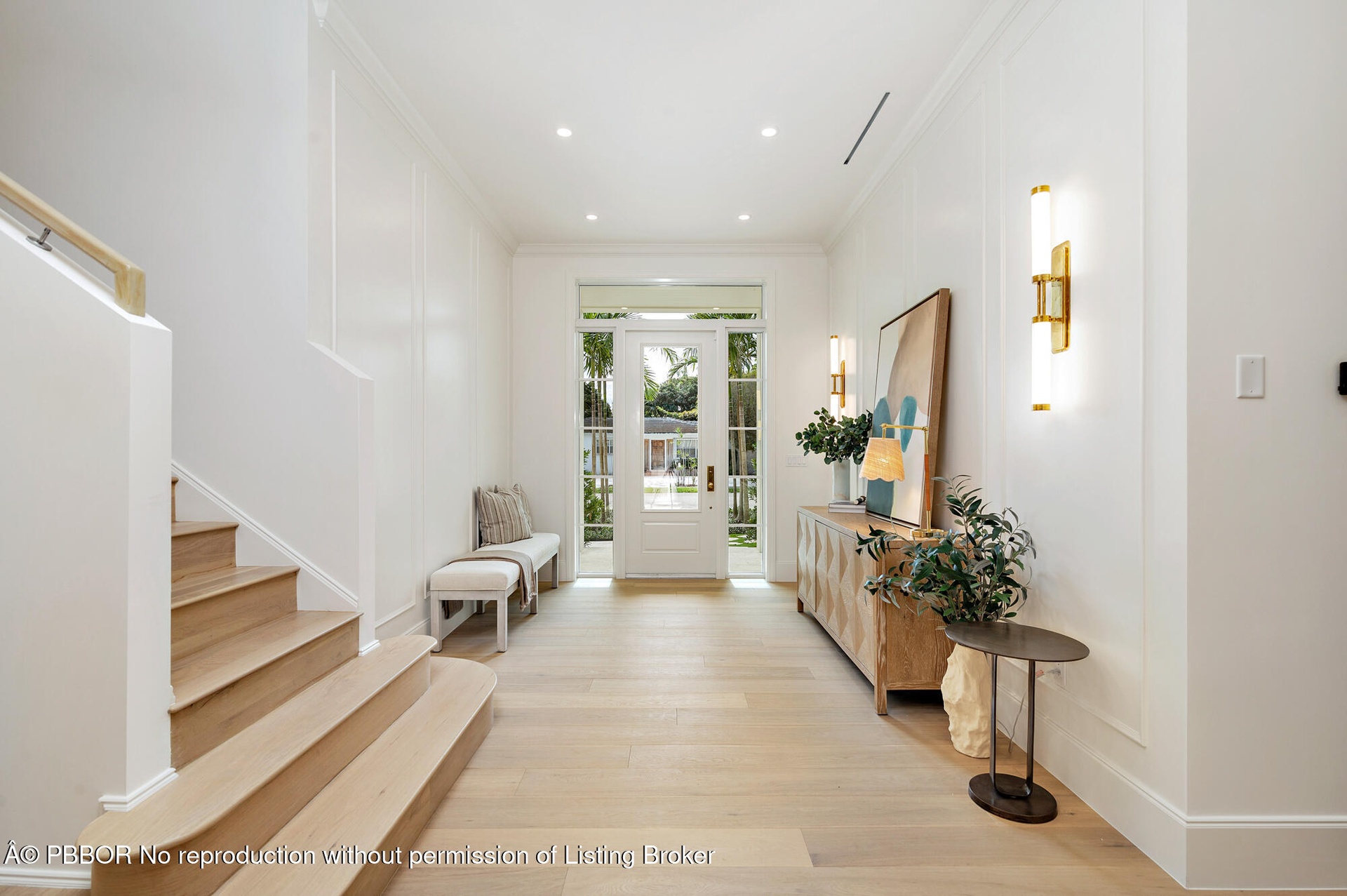 Situated yards away from Flagler Drive and the Intracoastal Waterway rests this stunning new construction home. Featuring 5 bedrooms, 5 full bathrooms and 2 powder rooms, this 5,660 total square foot home was built and designed with extreme attention to detail. Walking in the home, your eyes immediately affix to the incredible millwork. Every inch of this home was designed for the most discerning buyer. The kitchen is a dream come true boasting marble countertops, custom made cabinets, Thermador appliances, a Lacanche Range and a butler's pantry with ample storage space. With a built-in back-lit bar and custom built in shelving, the open concept family/ living/ dining room is both cozy and luxurious.