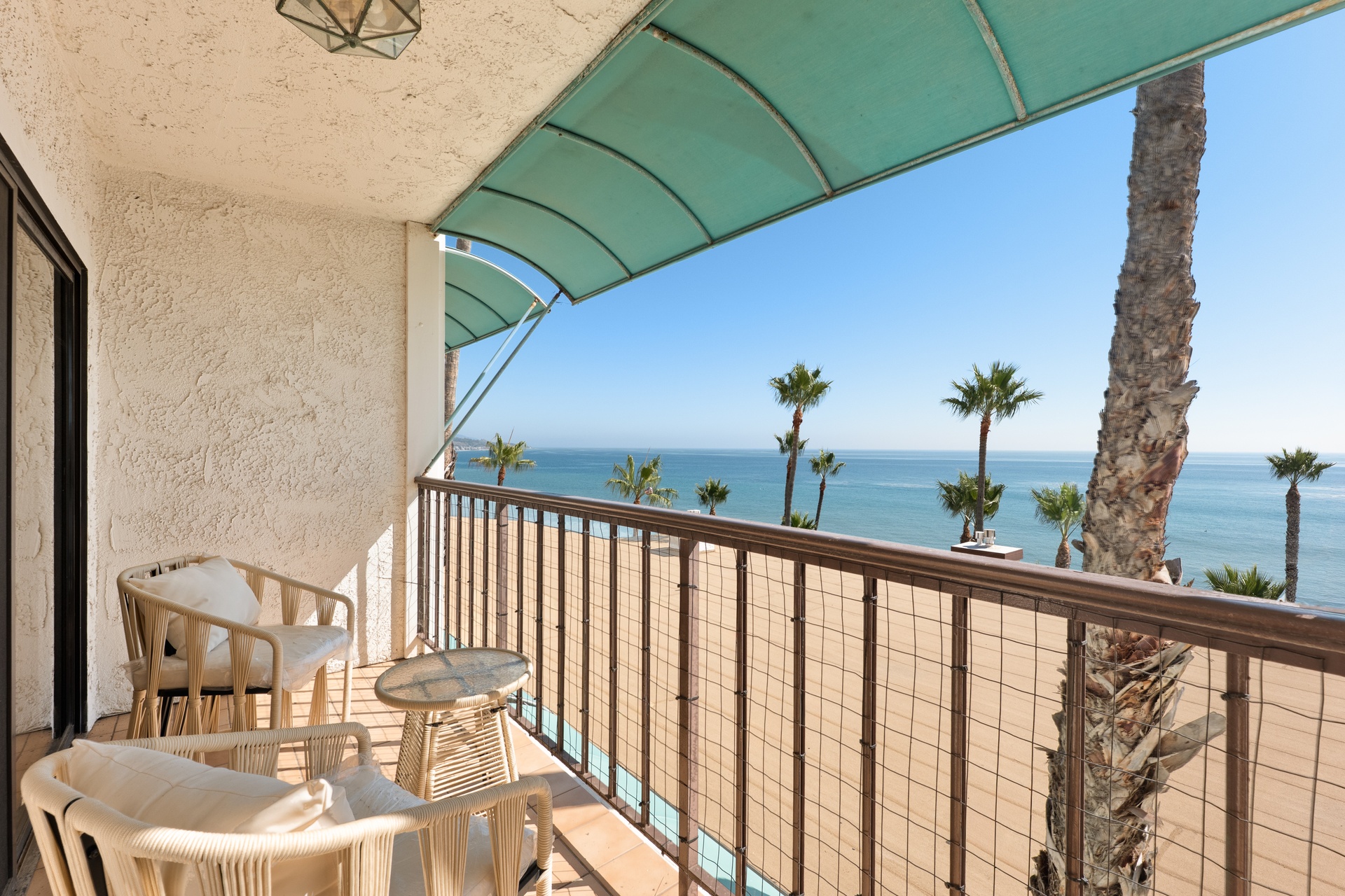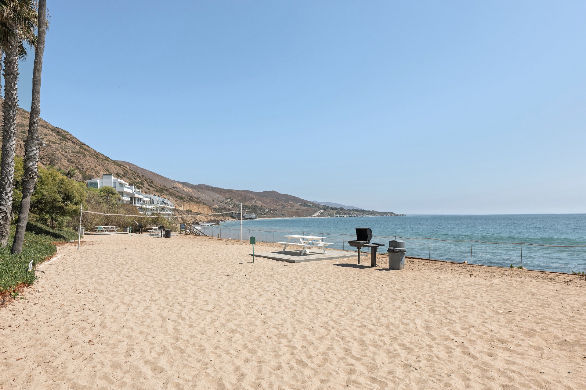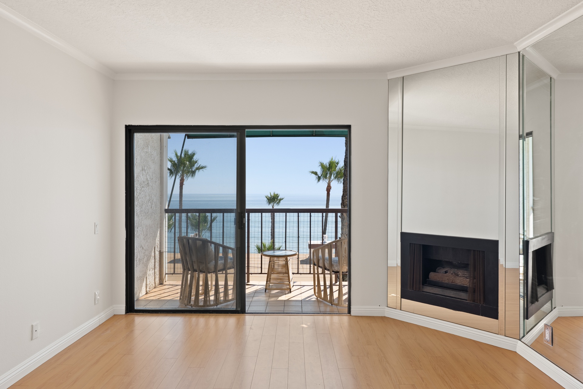 Welcome to a Prime Malibu Coastal Oasis | Ocean-View Resort Living -- Experience the art of seaside living in this impeccably presented one-bedroom, one-bath residence, where panoramic 180 degree ocean views and resort-style amenities define the pinnacle of Malibu luxury. Set within a prestigious guard-gated enclave with 24-hour surveillance and a staffed gatehouse, this ocean-view retreat embodies sophistication, privacy, and the effortless elegance synonymous with Malibu's coastline. The open-concept floor plan is designed to frame the Pacific at every angle, featuring a sun-filled living area with fireplace, mirrored wall, and seamless access to a private balcony overlooking the horizon-- a perfect spot for morning coffee, sunset wine, or simply listening to the soothing rhythm of the sea. The primary suite accommodates a king bed and offers both a walk-in closet and mirrored wardrobe, with direct balcony access revealing endless ocean vistas. A vanity area sits just outside the enclosed bath with a shower-tub combination, thoughtfully designed for both functionality and flow. The kitchen, complete with a bar counter, electric range, dishwasher, and microwave, opens gracefully to the dining area- ideal for casual entertaining or intimate dinners against a backdrop of ocean light. Ceiling fan and in-wall heating ensure year-round comfort. Community amenities rival a five-star resort: enjoy a heated pool and spa open until midnight, fitness center, sauna, clubhouse, and two tennis courts-- along with convenient elevator access connecting the pool and beach levels, ensuring effortless transitions throughout your stay. A private beach area with BBQs, shaded gazebos, volleyball court, and outdoor showers (at the pool, gym, and beach levels) completes the full Malibu coastal experience. A direct stairway to a world-famous surf break connects you to the sand and surf, inviting an active yet relaxing lifestyle defined by morning beach walks, sunbathing, ocean swims, and tranquil evenings under the stars. Additional highlights include two designated parking spaces (one subterranean and one upper-lot), ample guest parking, and a pet friendly community. Welcome to a turnkey, ocean-view escape within one of Malibu's most coveted beachfront communities. Act fast, this opportunity won't last long!