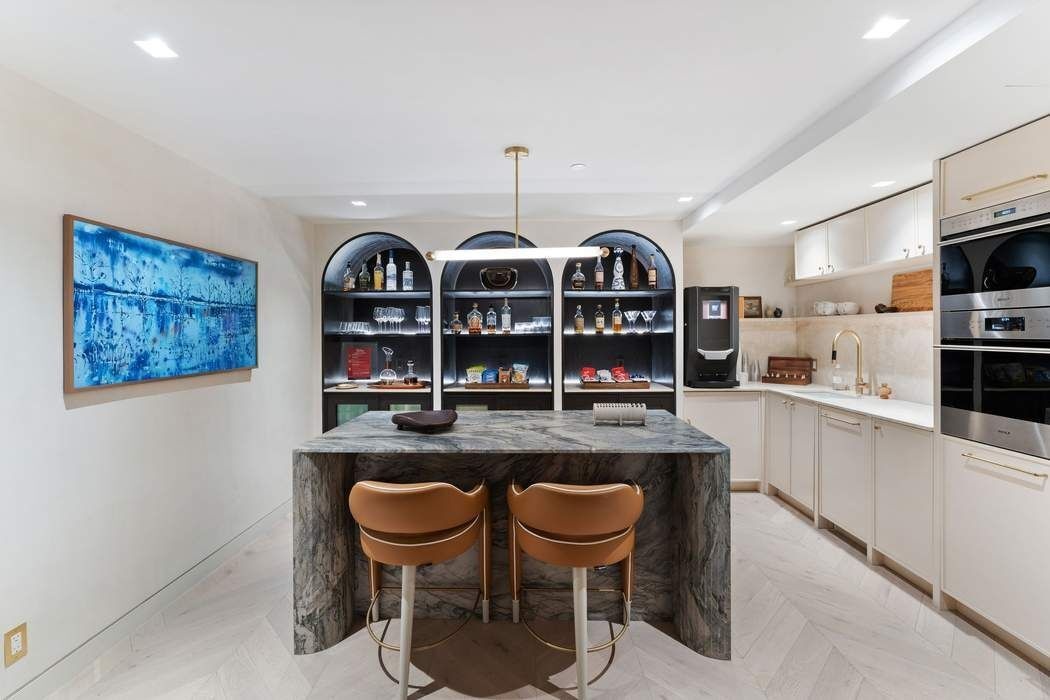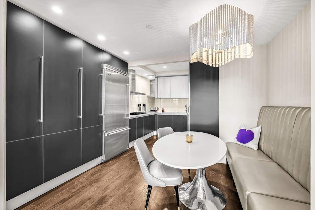 The sleek, spacious, eat-in kitchen with Central Park views, combines style and functionality with stone countertops, Miele and Viking appliances, a gas range, an additional mini freezer, and a built-in banquette perfect for casual dining.