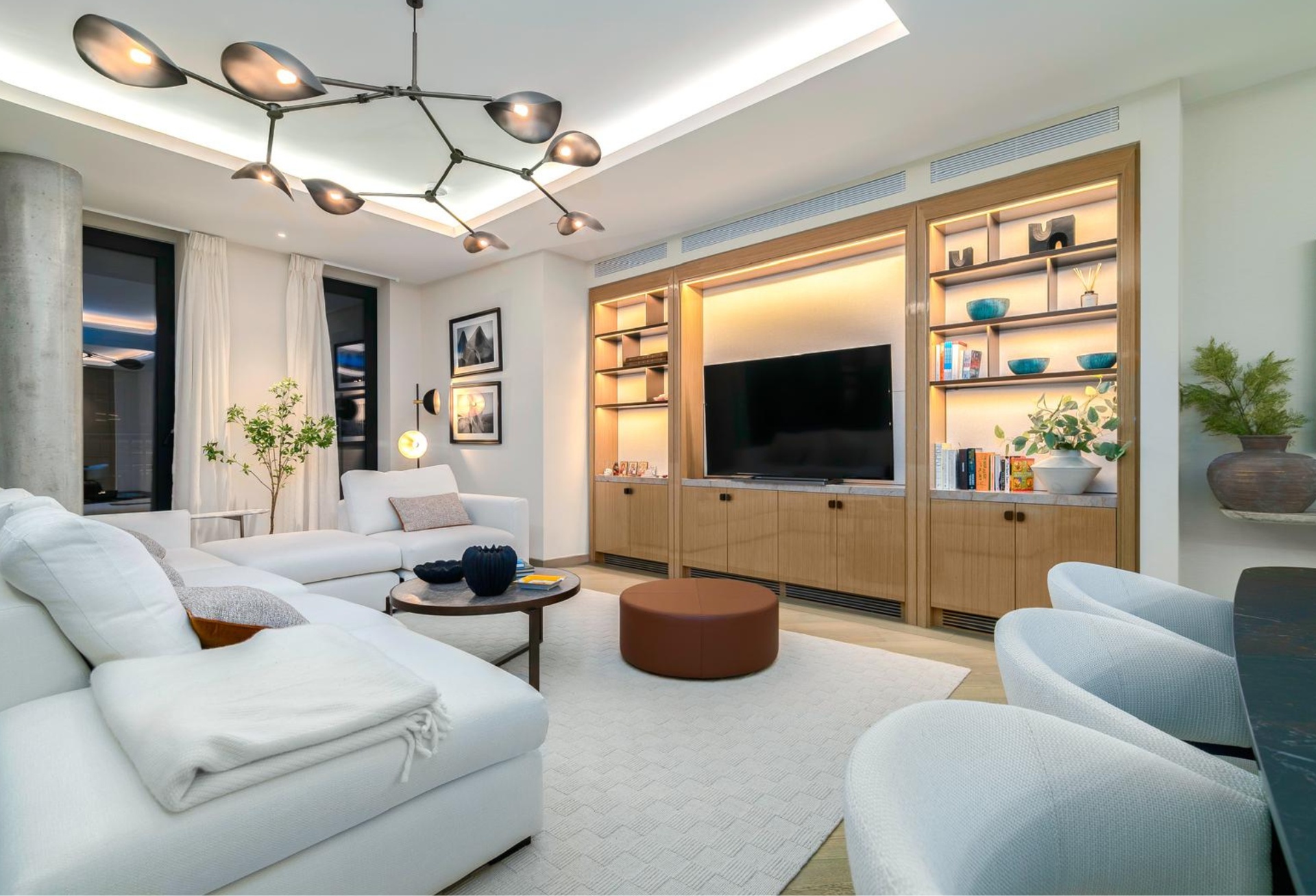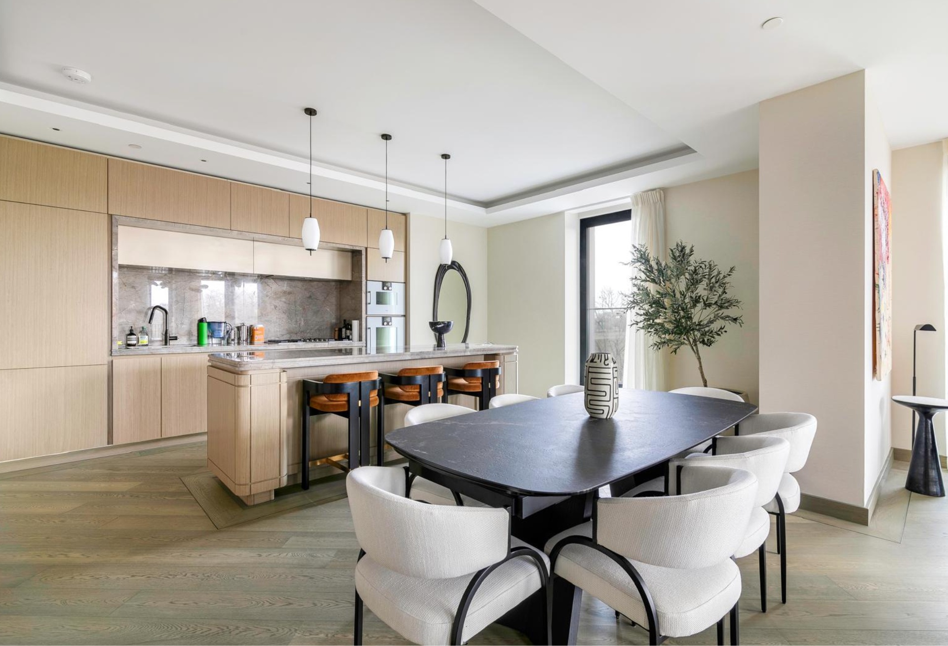The heart of the home is an expansive open-plan kitchen, living, and dining area designed for both intimate family moments and sophisticated entertaining. The chef's kitchen boasts top-tier Gaggenau appliances discreetly concealed within bespoke cabinetry, complemented by an island with integrated seating. The generously proportioned living and dining zones flow effortlessly onto two private terraces - perfect for alfresco dining while overlooking one of the world's most famous parks.