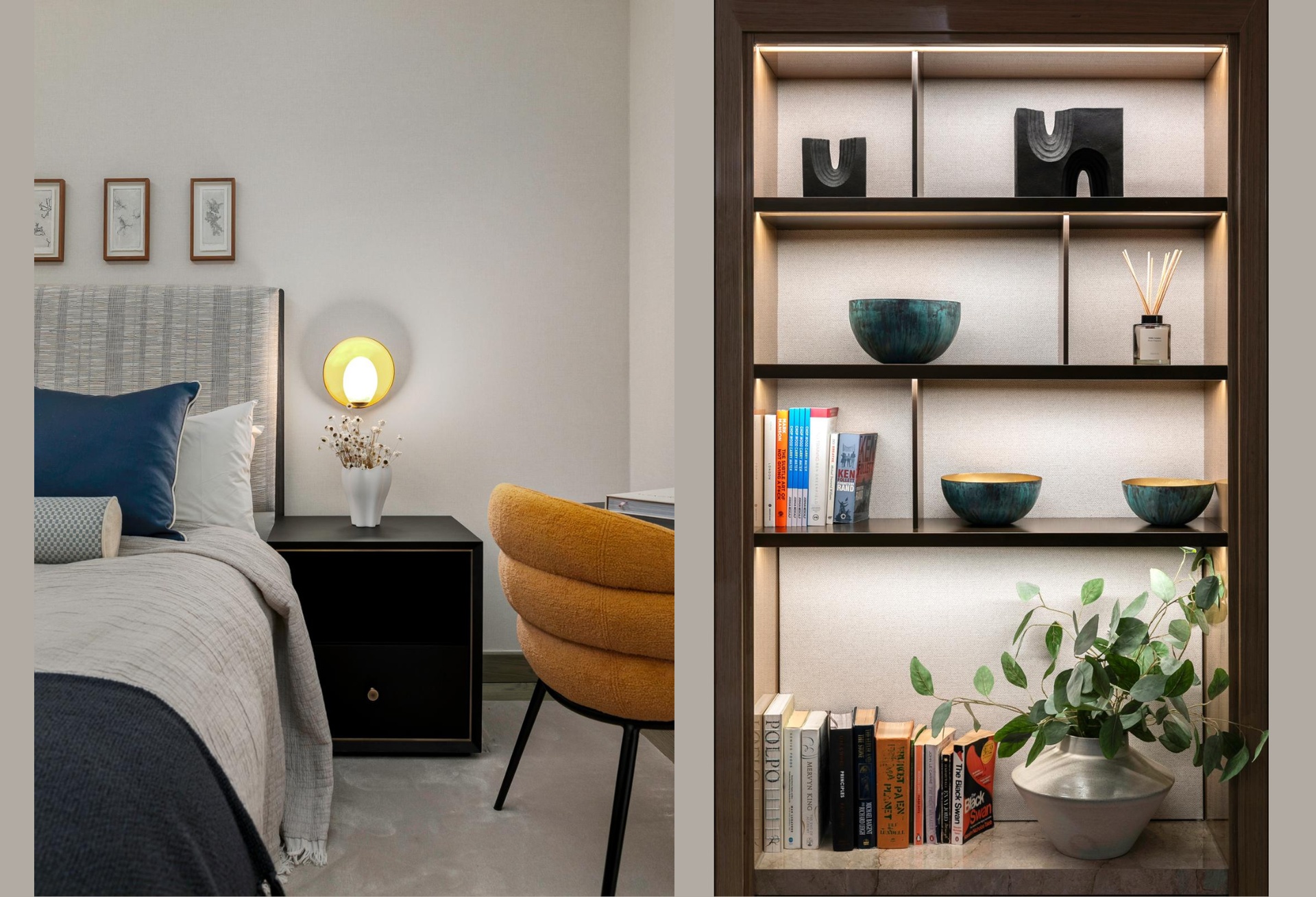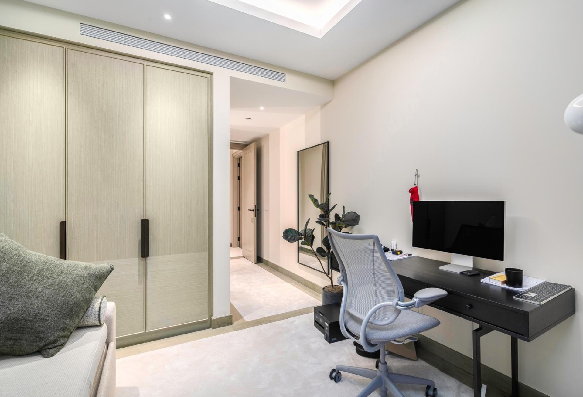 Three spacious double bedrooms each feature bespoke built-in wardrobes and en-suite bathrooms with exquisite marble finishes. The apartment also includes a dedicated study - ideal for those requiring a home office or private library. A fourth bathroom ensures convenience for family and guests alike.