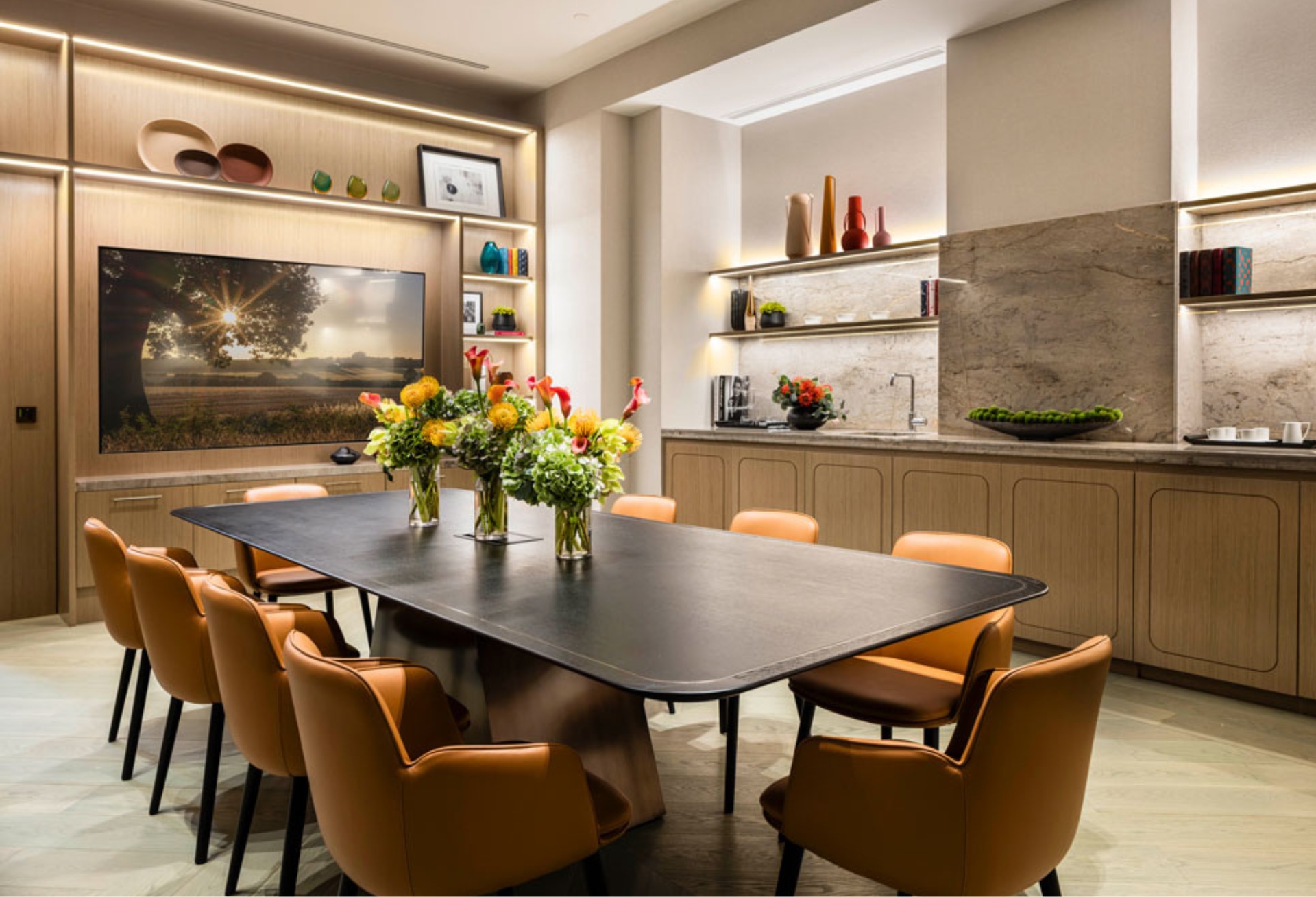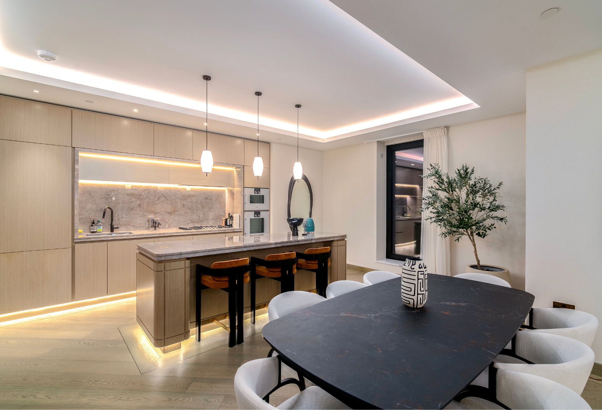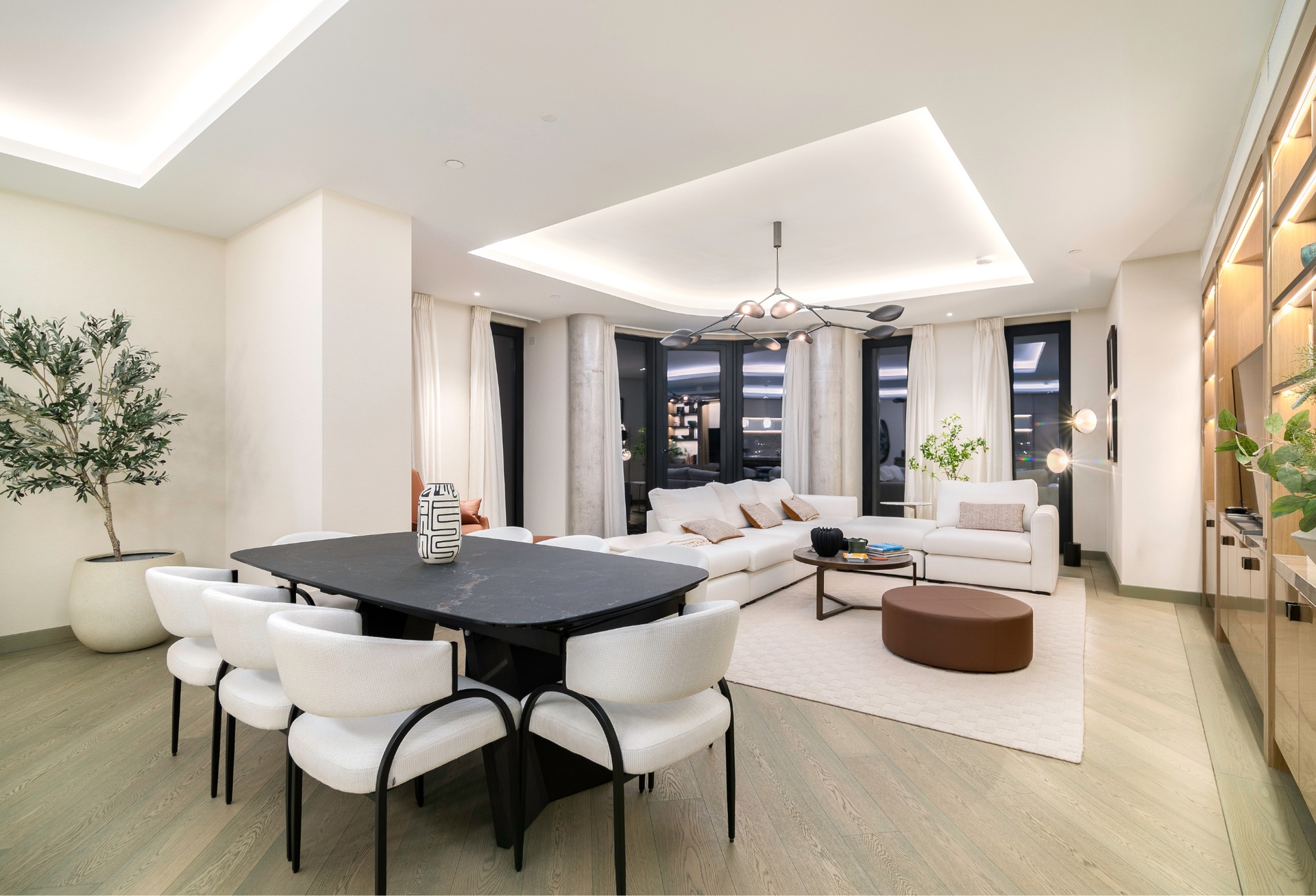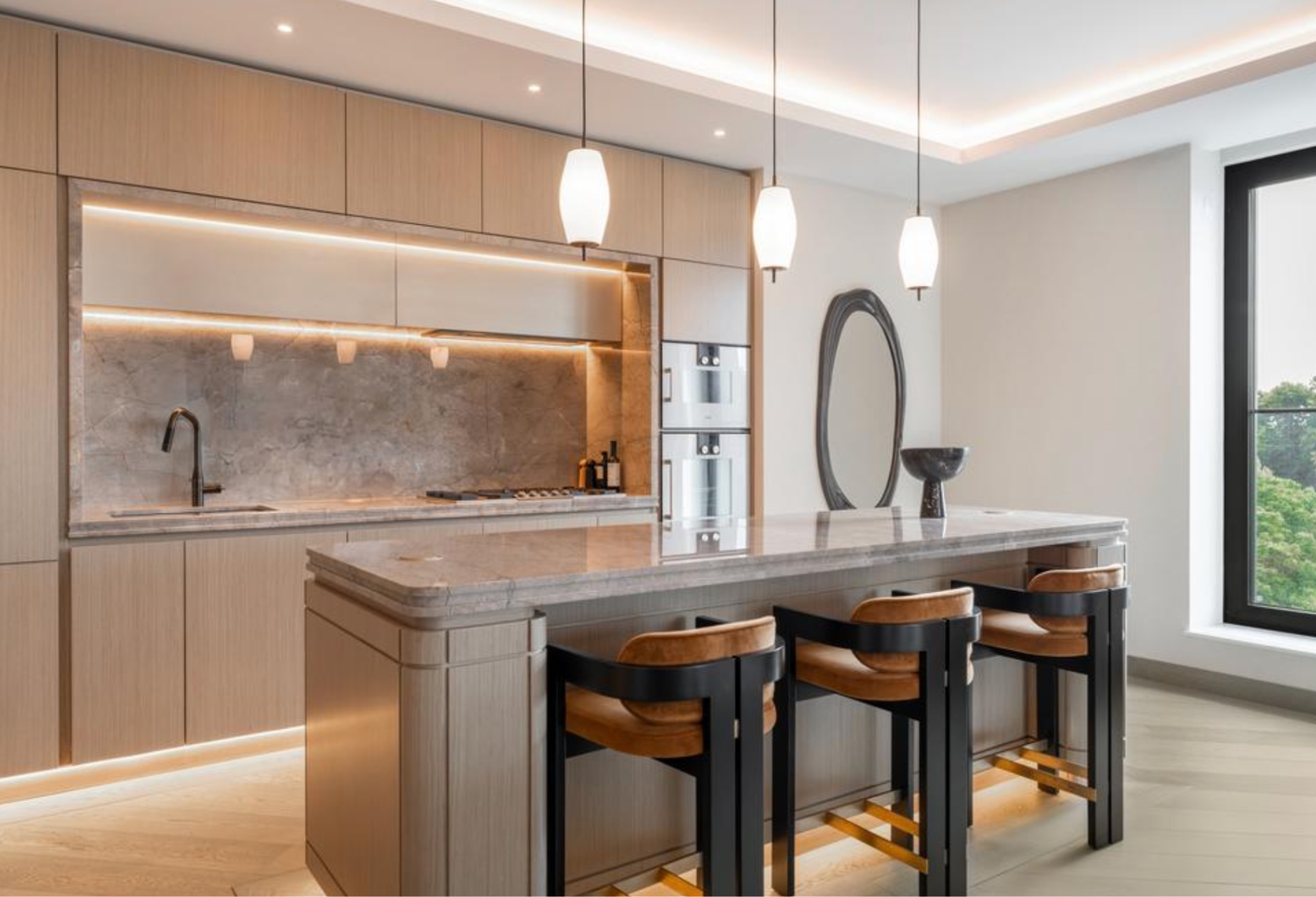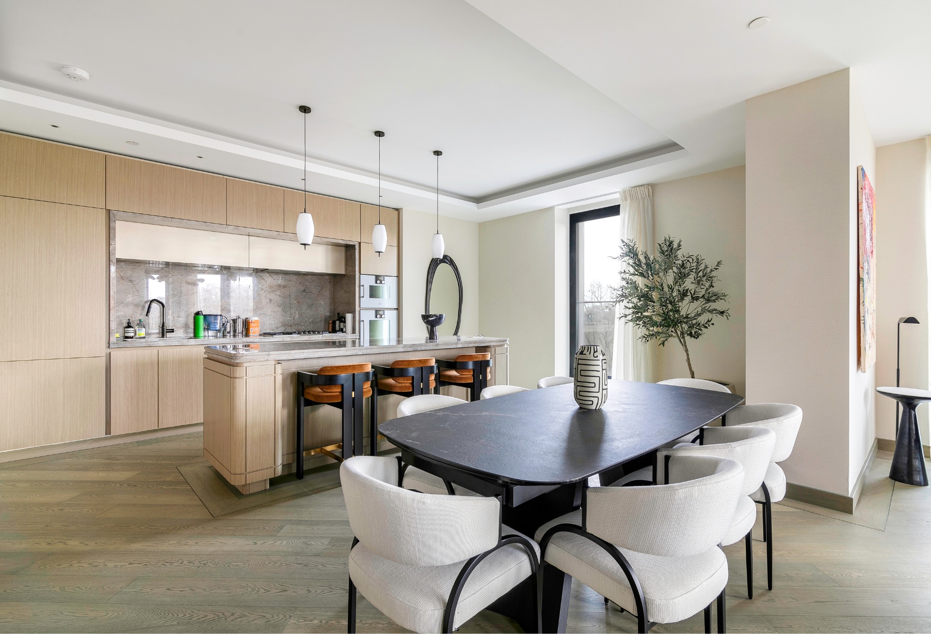 The heart of the home is an expansive open-plan kitchen, living, and dining area designed for both intimate family moments and sophisticated entertaining. The chef's kitchen boasts top-tier Gaggenau appliances discreetly concealed within bespoke cabinetry, complemented by an island with integrated seating. The generously proportioned living and dining zones flow effortlessly onto two private terraces - perfect for alfresco dining while overlooking one of the world's most famous parks.