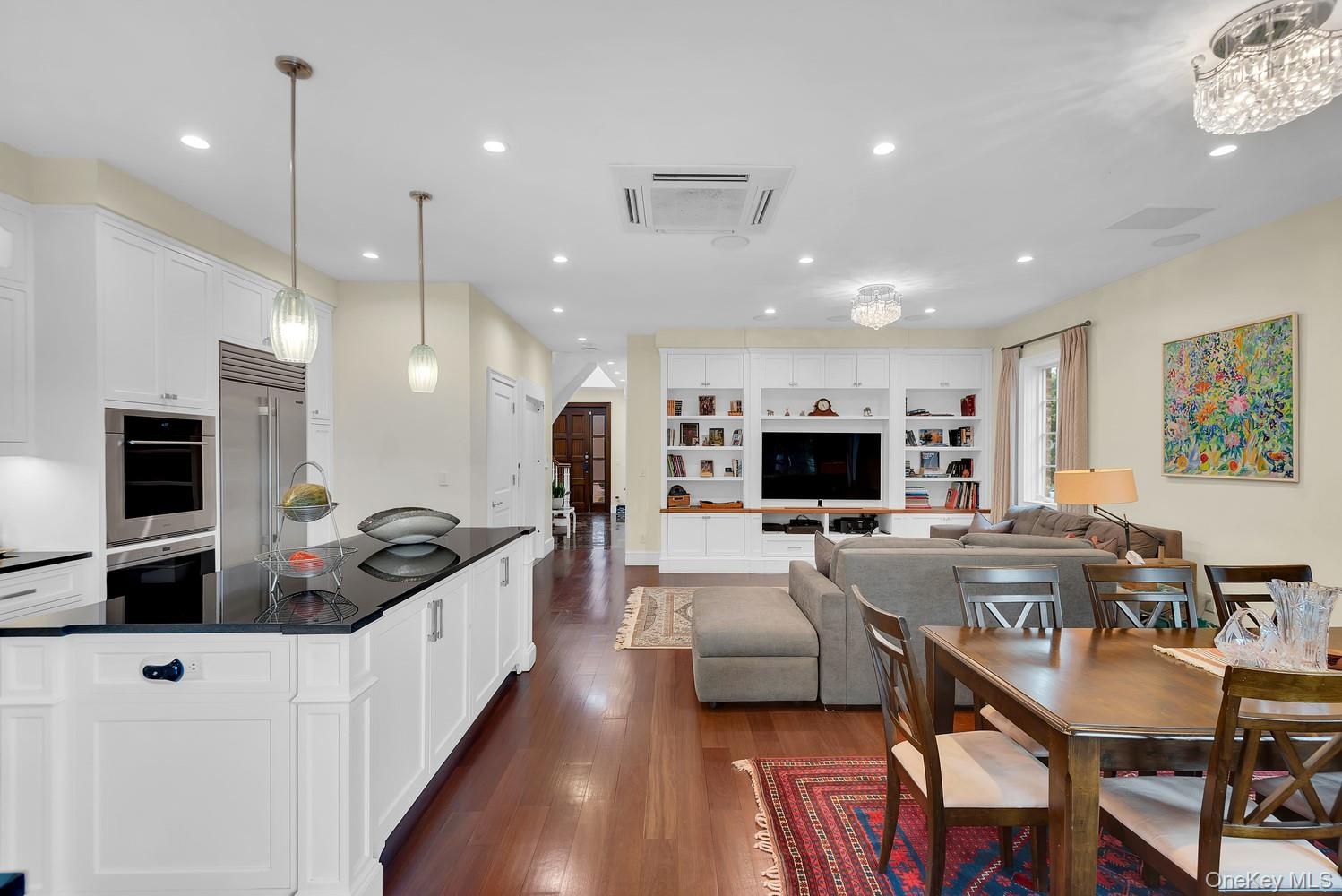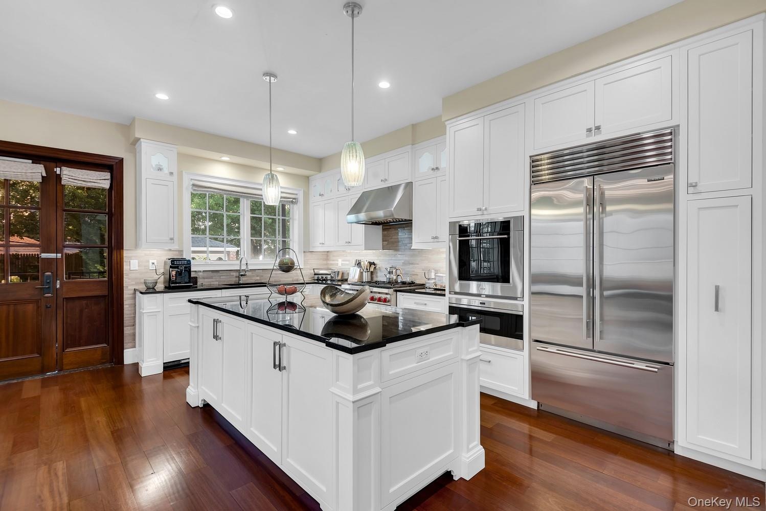 The grand foyer sets the tone, showcasing 21-foot ceilings, a sweeping staircase, and a showstopping chandelier that instantly captivates. Just off the entrance is a private family room with its own full bath—ideal as a guest suite, media room, or home office. Continue through the main level to discover an expansive open-concept living room, dining area, and chef’s kitchen that seamlessly flow together beneath magnificent 11-foot ceilings. The kitchen is equipped with Sub-Zero refrigeration, Wolf cooking appliances, quartz countertops, and beautifully crafted custom cabinetry. A convenient half bath and access to the covered patio and generous backyard complete this exceptional floor.