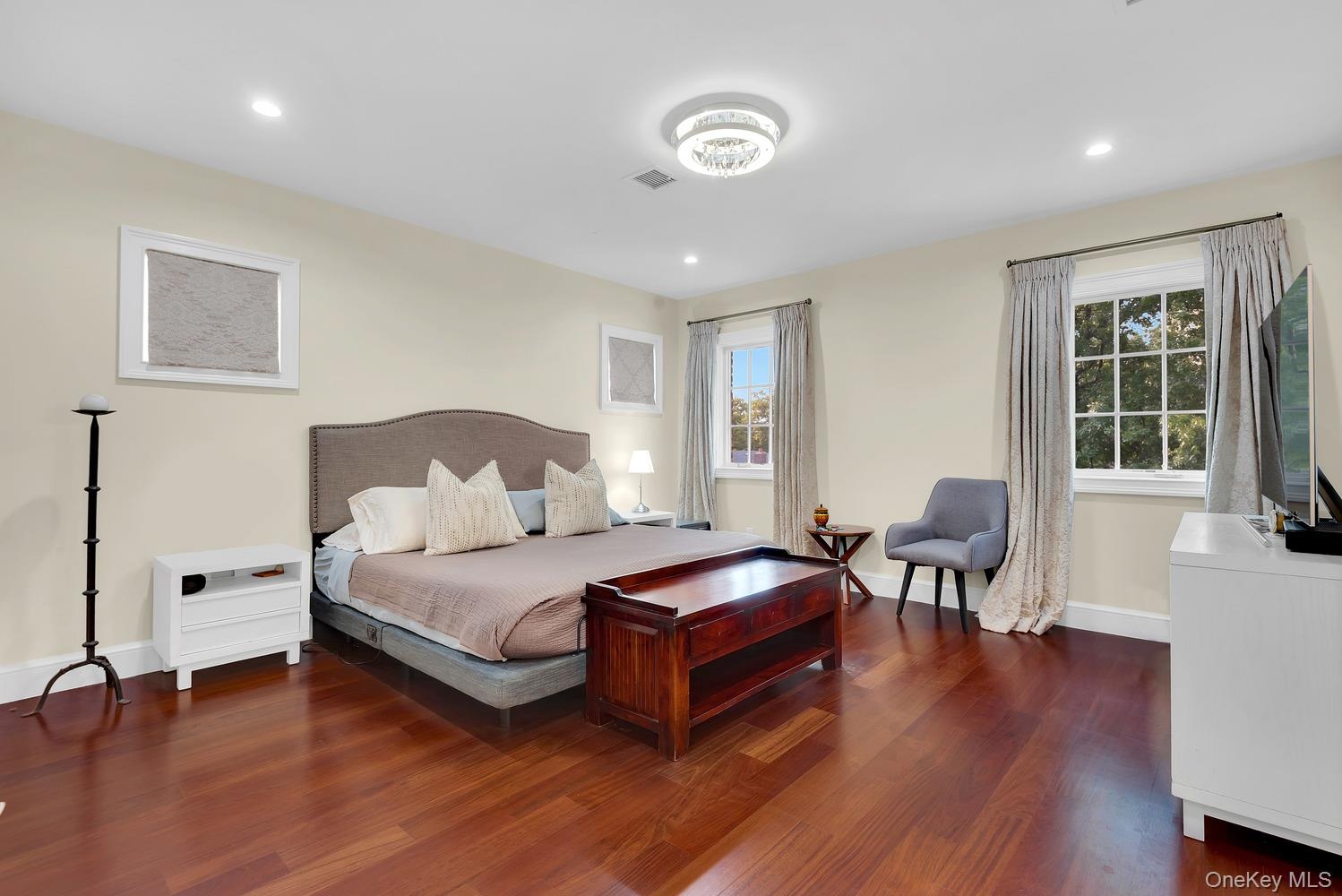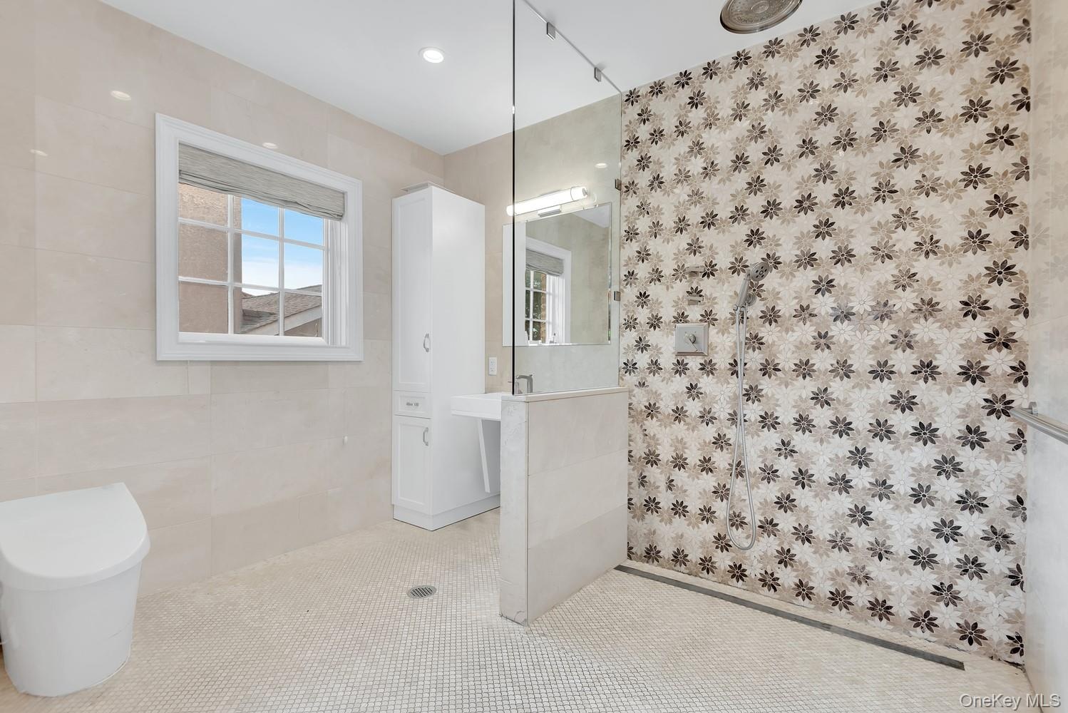 The second level offers three spacious bedrooms, including a serene primary suite designed to feel like a personal retreat. The main hall bath is ADA-accessible for added convenience. The oversized primary bedroom is complemented by an extraordinary walk-in closet—large enough to function as a dressing room or private office—and a spa-inspired ensuite featuring radiant heated floors, a double-wide vanity, a luxurious whirlpool tub, and rainfall shower. This level continues the home’s airy elegance with 10-foot ceilings throughout.
