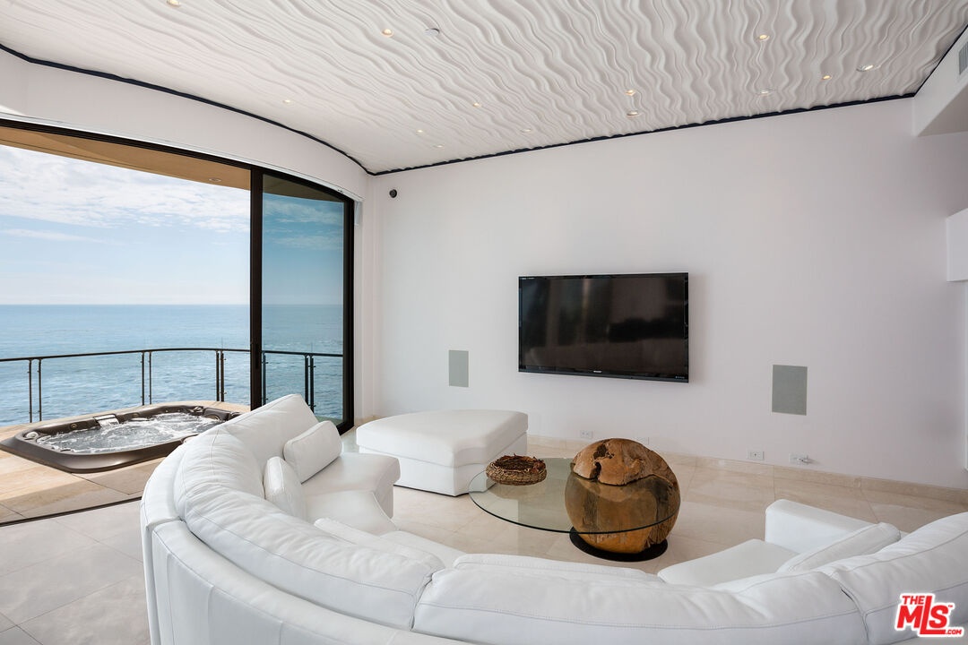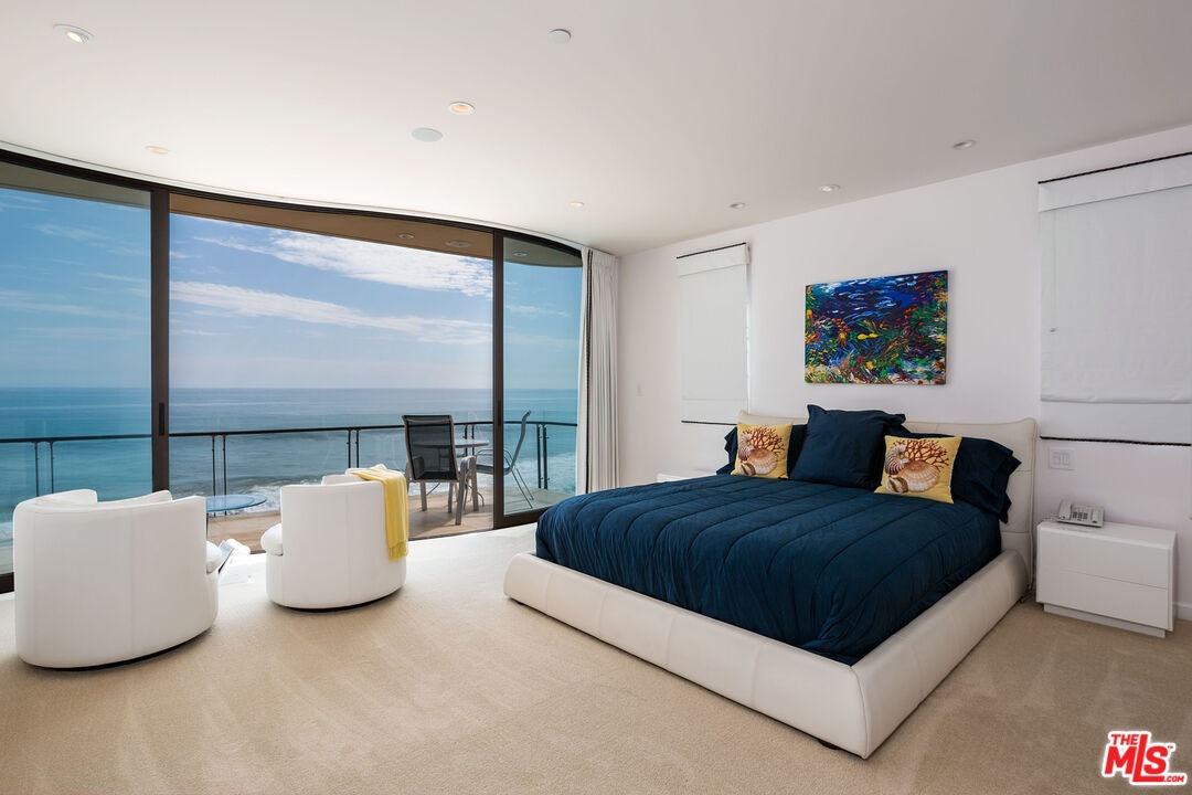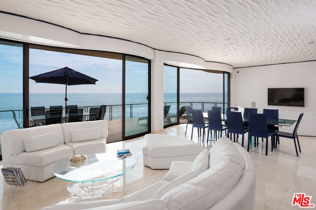 Dolphin House with celebrity style, and 55 feet of Malibu Road beach frontage, Sinuous curves, white marble floors, and sleek contemporary furnishings. Walls of glass and two spacious beachfront balconies take in the expansive ocean and island panorama. The main living area is wide, curved Fleetwood stacking glass doors open onto a full-width deck complete with Jacuzzi, Lynx barbecue. The living area comprises two seating areas with exquisite Italian leather furniture, two flat screens, and a fireplace (one of four in the home). Between the sitting areas is a stunning glass dining table for ten guests, and adjacent to that is a fully equipped and stocked horseshoe-shaped bar with a beverage cooler, custom chandelier, and bar seating. The dual-island gourmet kitchen features wood cabinets, rare granite, and onyx countertops, top-of-the-line appliances, an indoor grill, a dumbwaiter to the second-floor kitchenette. Upstairs, accessible by steps or elevator, are three suites, two with ocean views and curved glass doors onto another full-width deck, and one suitable as an office, media room, or guest suite. Lavish spa-style bathrooms, equipped with integrated smart-home amenities, air conditioning, radiant floor heating, security, a two-car garage, standby generator, intercom, and automated sun shades. Lease price to be $45,000 for 1 year term leases. Summer 2026 rate to be.. June $50,000, July and August $69,000 per month, September $50,000 per month. Short term rate to be $47,000 per month